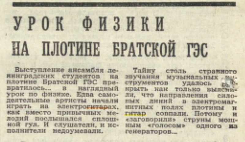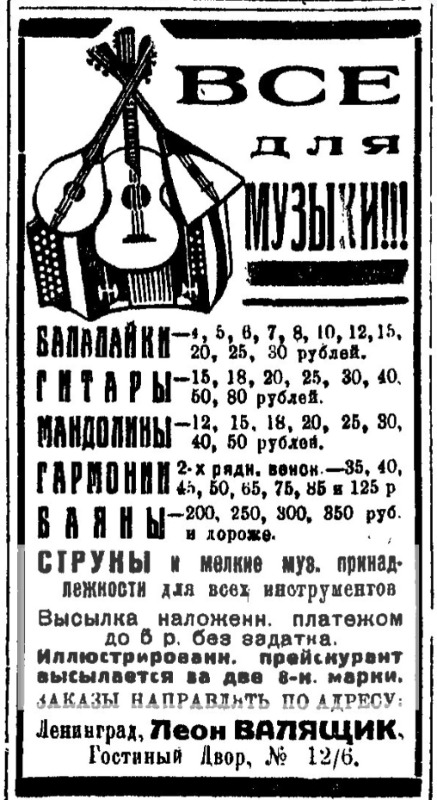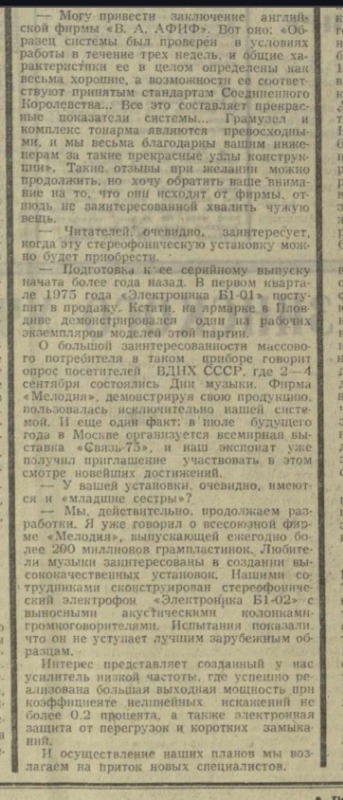 [link] «Ригас Балсс», 07/1972 ... На предприятиях тяжелой промышленности Риги проводится усиленная работа по расширению ассортимента товаров народного потребления, освоению новых видов изделий. Так, завод полупроводниковых приборов работает над освоением нескольких новинок, таких, как звукосниматели с предусилителем для электрогитар, электронные ревербераторы для музыкальных инструментов, автосторожи и др.... Мы порой, с волками споря, Воем в си-бемоль-миноре...