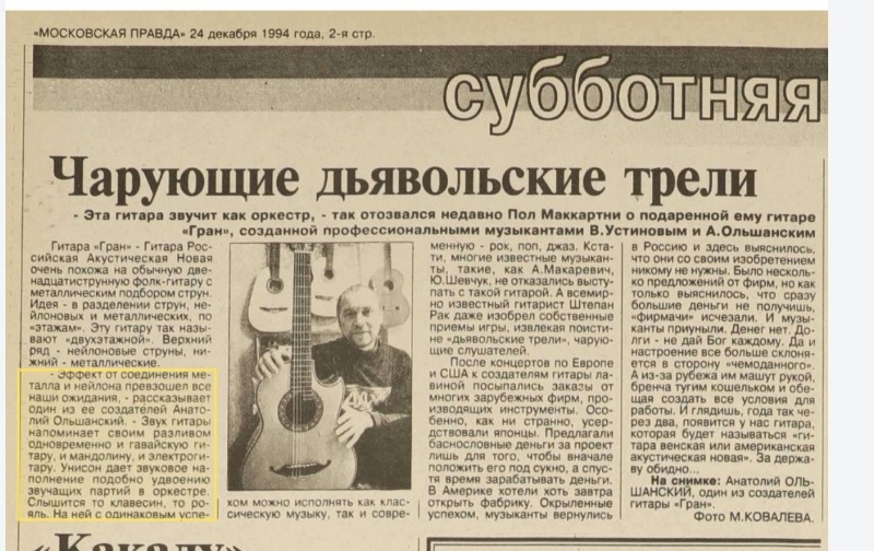 Про гитару "Гран" с "двухэтажным" расположением нейлоновых и металлических струн, 24 декабря 1994 г. [link]