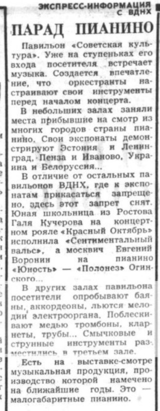 По-видимому, именно об этой "показательной" демонстрации "Ретаккорда" на ВДНХ упоминается в заметке "Парад пианино" в газете "Московская правда" от 24 августа 1965 г., с. 3 [link] : Мы порой, с волками споря, Воем в си-бемоль-миноре...