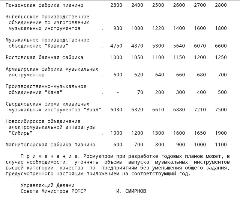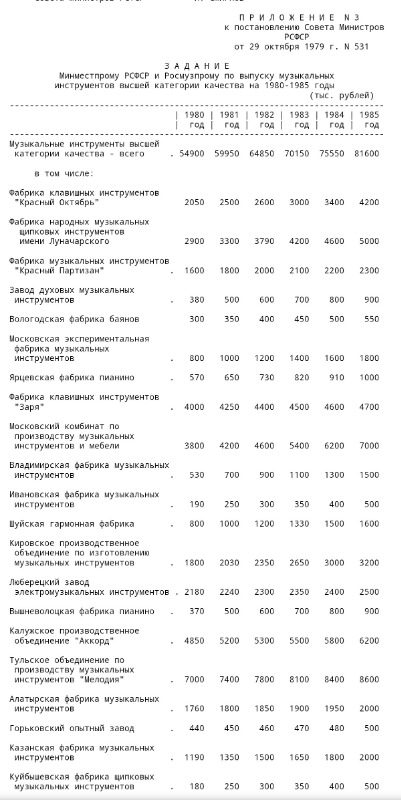 Несколько неожиданный перечень предприятий, призванных выпускать "МУЗЫКАЛЬНЫЕ ИНСТРУМЕНТЫ ВЫСШЕЙ КАТЕГОРИИ КАЧЕСТВА" в 1980-1985 годах: [link] С о в е т М и н и с т р о в Р С Ф С Р П О С Т А Н О В Л Е Н И Е от 29 октября 1979 г. N 531 г. М о с к в а