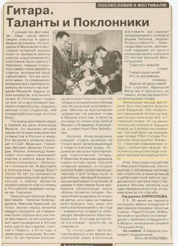 Про использование гитары "ГРАН" Анастасией БАРДИНОЙ в ходе финальных концертов VI Московского фестиваля гитарной музыки, "Московская правда", 19 июня 1996, с. 5: [link]