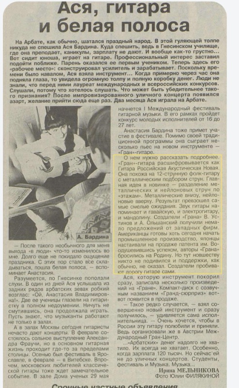 О записи компакт-диска под названием "Гранд-сюрприз" гитаристкой Асей (Анастасией) БАРДИНОЙ с использованием гитары "ГРАН" - "Вечерняя Москва", 14 марта 1995 г., с. 8: [link]