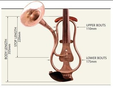 У инструмента меньшая диафрагма, чем у других фоно-скрипок, что делает его звучание гораздо более лёгким. Завиток и гриф изготовлены из простого клёна и покрыты лаком цвета сливы. Длина грифа инструмента составляет 130 мм, но другие важные параметры значительно отличаются от нормы, включая длину струн 348 мм, что на 20 мм длиннее, чем у стандартной скрипки.