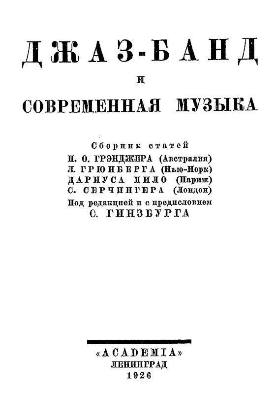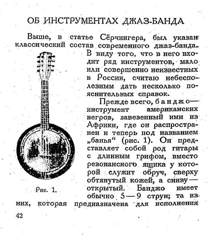 В 1926 году инструмент БАНДЖО был, оказывается, настолько малоизвестным в России, по утверждению составителя сборника и автора статей про джаз М. Гинзбурга, что при подготовке издания не нашлось изображения банджо с укороченный струной, описание которого дано в тексте, - вместо этого приведено изображение 8-струнной банджолины: [link] Мы порой, с волками споря, Воем в си-бемоль-миноре...
