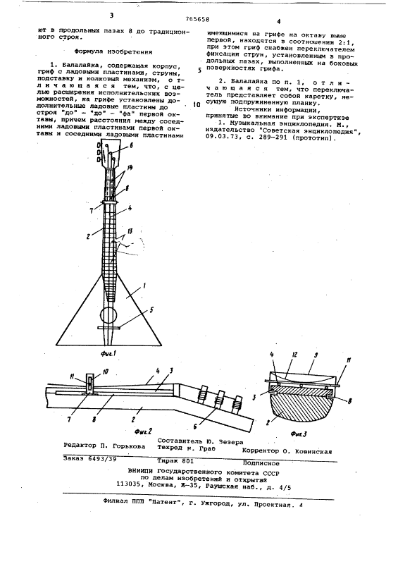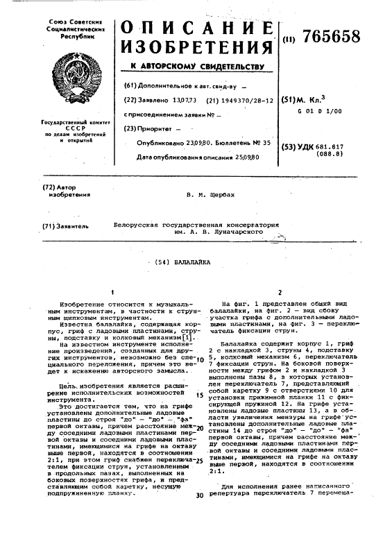 Белорусская балалайка с раздвижным грифом, - изобретение заявлено в 1973 г., опубликовано в 1980 г. Автор - ЩЕРБАК ВАЛЕНТИН МИХАЙЛОВИЧ (Белорусская Государственная консерватория им.А.В.Луначарского). [link]