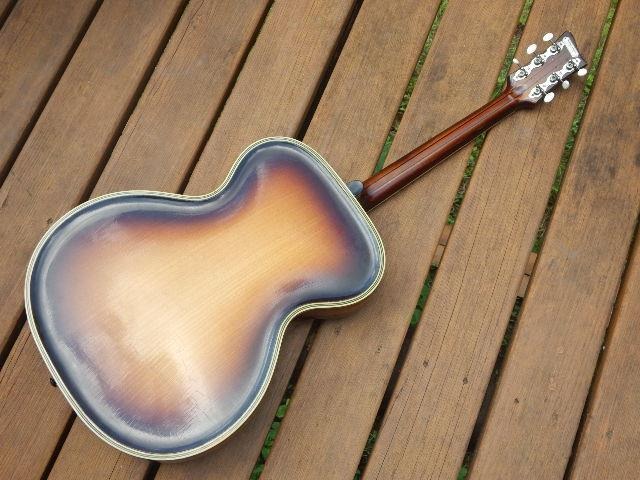 Когда Кройль бежал из Маркнойкирхена в Западную Германию, а затем в Норвегию, он, по-видимому, оставил после себя по крайней мере несколько незаконченных инструментов и деталей, и «франкенштейны» с маркировкой ROAL встречаются довольно редко. Мой экземпляр, возможно, один из них, хотя Стефан Лоб считает его подлинным инструментом Кройля. Резонаторные отверстия не похожи на те, что используются на стандартных моделях Кройля — Diamant или Rubin, но Кройль говорил, что ему нравится свобода, которую дает изготовление гитар (в отличие от скрипок), поэтому он вполне мог экспериментировать с разными формами. Говорят, что он подписывал все свои инструменты внутри, но я не могу найти подпись на этом инструменте, только старую этикетку от MIGMA, одного из ключевых восточногерманских дистрибьюторов. Гриф крепится болтами Stauffer, а не клеем, и он любил использовать бридж verdrehtes Ochse («скрученные быки» — потому что он похож на скрученные рога быка), который есть и у моей гитары — обе эти особенности типичны для ГДР. Он был необычен тем, что проектировал накладки, которые не закрывали верхнюю часть f-образного отверстия. На грифах часто встречались небольшие треугольные метки с одной стороны (как у гитар Seifert), но друг прислал мне фотографию грифа Kreul, который он купил, и у него такие же угловые инкрустации, как у моего. У всех грифов Kreul есть длинный участок без ладов в конце накладки, в котором часто спрятан звукосниматель Rellog.