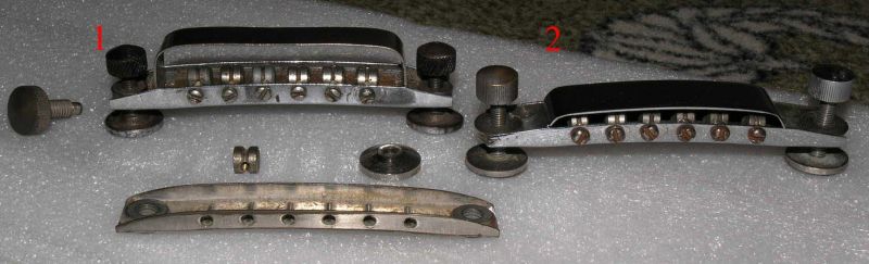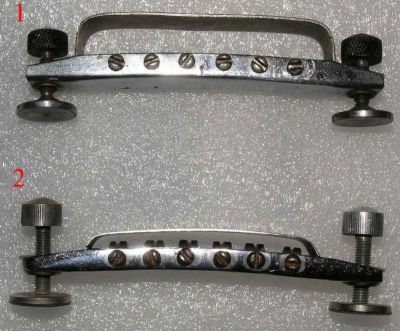 Вот что откопал : Бридж моего Гонга не разбирается, крышка прижата развальцованными гайками стоек,винты регулировки мензуры просверлены и тоже развальцованы, пружин на последних нет. Рядом бридж Крунка (2) и запчасти от бриджа Рубина.
