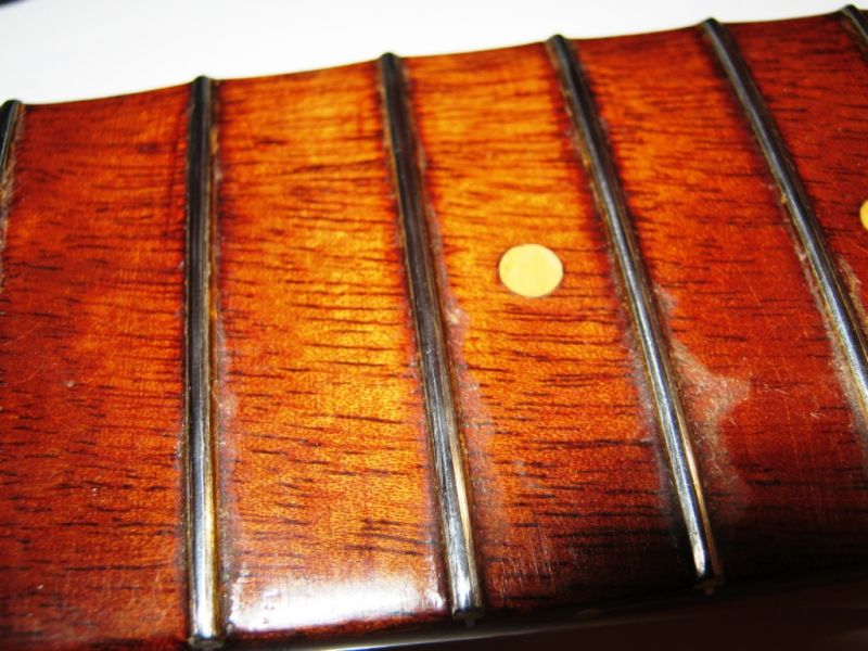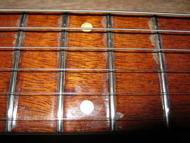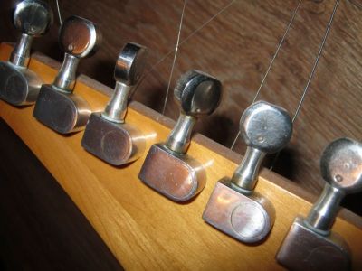Продолжаем тем не менее про гитарку, если вы не возражаете)))) Грифы мастер делал, как полагается в 99% случаев из клена. Накладки в основном из красного дерева, правда проскакивали иногда более экзотические благородные породы, но это были эксклюзивные дорогие гитары не досягаемые для нас. Часто грифы были цельные - без накладок, но в обоих вариантах ( с накладкой или без), было усиление- вклейка с тыльной стороны аля страт. Визитная карточка - это стальные лады, которые мастер катал сам на вальцах. По сравнению с нейзильбером они практически вечные и всегда блестящие.