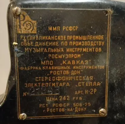 № 15915. Номера звукоснимателей: моно 058392 (ну или 394, но мне кажется съехавшая вверх 2, снизу отпечатано повторно); стерео 009550 и 009435. Информация не особо достоверная, в комплекте было запчастей ещё на гитару. Со слов предыдущего владельца, от донора только ручки потов и корпус, взамен треснувшего. Второго некплейта нет, второй пикгард - красная искра с ОТК за август 1983г. Остальные запчасти непримечательны. Шпон с накладки видимо удален при первой замене ладов.