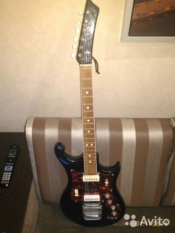 Тоника ЭГС-650 РСТ РСФСР 83-70 №21285. Черная, накладка на голове грифа - белая, пикгард - зеленый искристый (ныне серый с болотным оттенком), на датчиках VI-73, на потцах 0573.