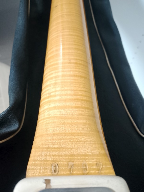 Гриф крепится к деке через классический же плоский трапециевидный некплейт. Здесь же видно серийный номер, выбитый на пятке грифа.
