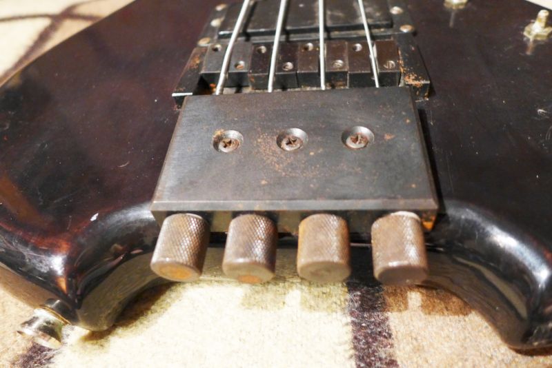 Общий вид. Крутилок нет, один регулятор держится на бумажке, хотя гайка имеется. Цвет полиэфира черный, но слой, как видно, тонкий. Много протертых мест. Гриф в районе пятки достаточно широкий, вполне пятиструн получился бы.