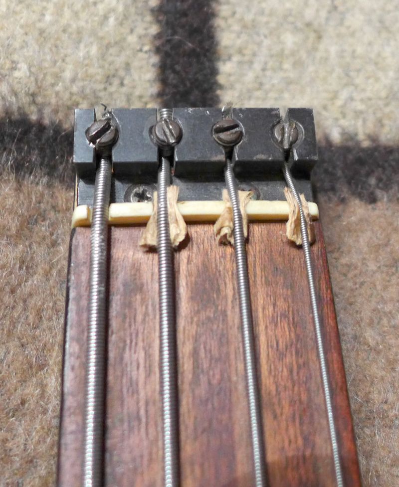 Крепление струн. Опять бумажки в помощь. Видимо, порожек под замену. Пойти костей накупить?