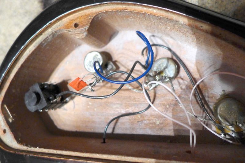 Кишочки. Проводка обычным проводом. Две громкости и тон. Синглы. Нековый не работает, пока не разбирался отчего так.