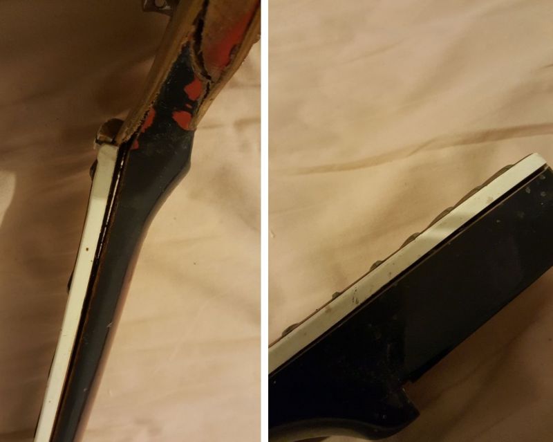 | Лично я с грифом большой беды не вижу. Это клеится с усилением деревом. Эпоксидку если оторвать, то дека частично отошла? Можно вычистить и применить нормальный столярный клей? Накладку тоже снова приклеивать, нулевой лад ведь пилёный для первой струны? - на замену, зубофрезеровку заклеивать деревом, предварительно придав дыре какую-никакую предсказуемую форму... По-моему, канта нету там, где ЭПС. Придётся добыть и приклеить. Плюс восстановление лакокрасочного. Работы весёлые, но не думаю, что неосуществимые.