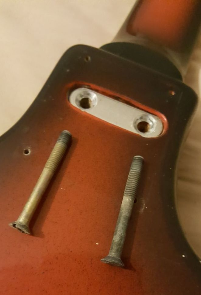 Итак – разбираем. Пластина крепления грифа дюралевая, крепление стандартное - два винта в якорь анкера.