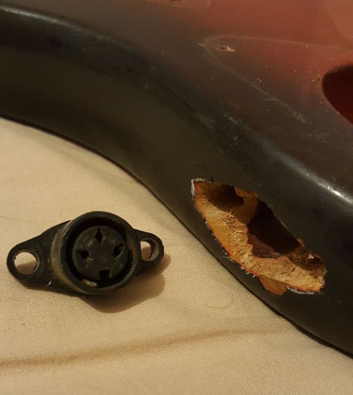 Угандошена (извиняюсь за свой французский, но другого слова просто не подобрать) гитара знатно. Верхняя фанерка отошла от деки и присобачена обратно с помощью незаменимых друзей любого доморощенного гитарного «мастера» советского периода – эпоксидки и шурупов