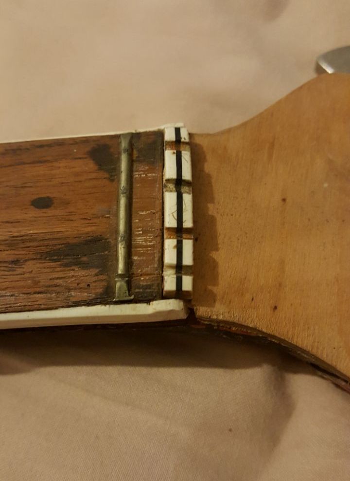 Лады, несмотря на возраст, относительно свежие. Да и ЛКП и всё остальное свидетельствует о том, что покалечили гитару в молодом возрасте, и после «ремонтов» играли совсем немного. Да и бросили.