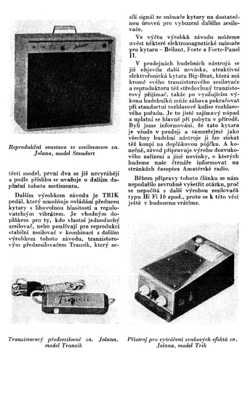 Чехословацкий журнал "Радиоконструктор", 1965, номер 2, с. 65, раскрыл истинное предназначение инструмента Jolana Big-Beat: [link] Konstrukter 1965-02.pdf "...Еще один продукт завода — педаль TRIK, позволяющая управлять игрой на гитаре с помощью любой громкости и регулируемого вибрато. Это подходящее дополнение для тех, кто имеет простой усилитель или использует стабильный усилитель для воспроизведения в сочетании с другим продуктом завода — транзисторным предусилителем Transik, который усиливает сигнал от гитарного звукоснимателя до уровня, достаточного для возбуждения другого усилителя.