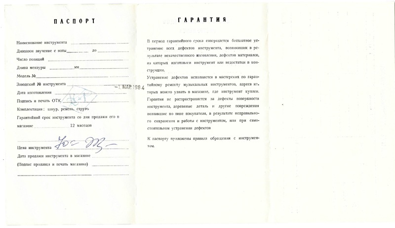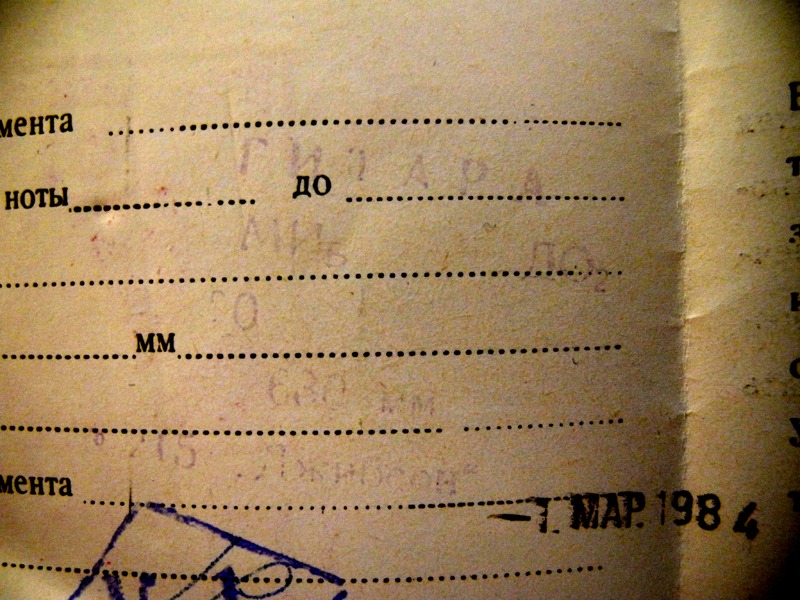 Орфей Джибсон. Артикул 215. 1 марта 1984. Металлический бридж. Изначально отсутствует пикгард и надпись "Джипсон". Гитара была куплена новой в Новосибирске, в магазине "Мелодия" летом 1984 года. С тех пор она жила в одном и том же доме у одного и того же гитариста, который менял только струны. Даже шурупы крепления подвеса для струн, порвавшие своими шляпками обивку дивана, остались на месте. Потом (как принято) отклеился гриф, задребезжала пружина и гитара ушла на пенсию. Через 30 лет её вместе с этой историей подарили мне. А я приклеил на место отклеившиеся гриф и пружину. Надписи в паспорте на скане не видны. Макросъёмкой и фотошопом удалось вытянуть.