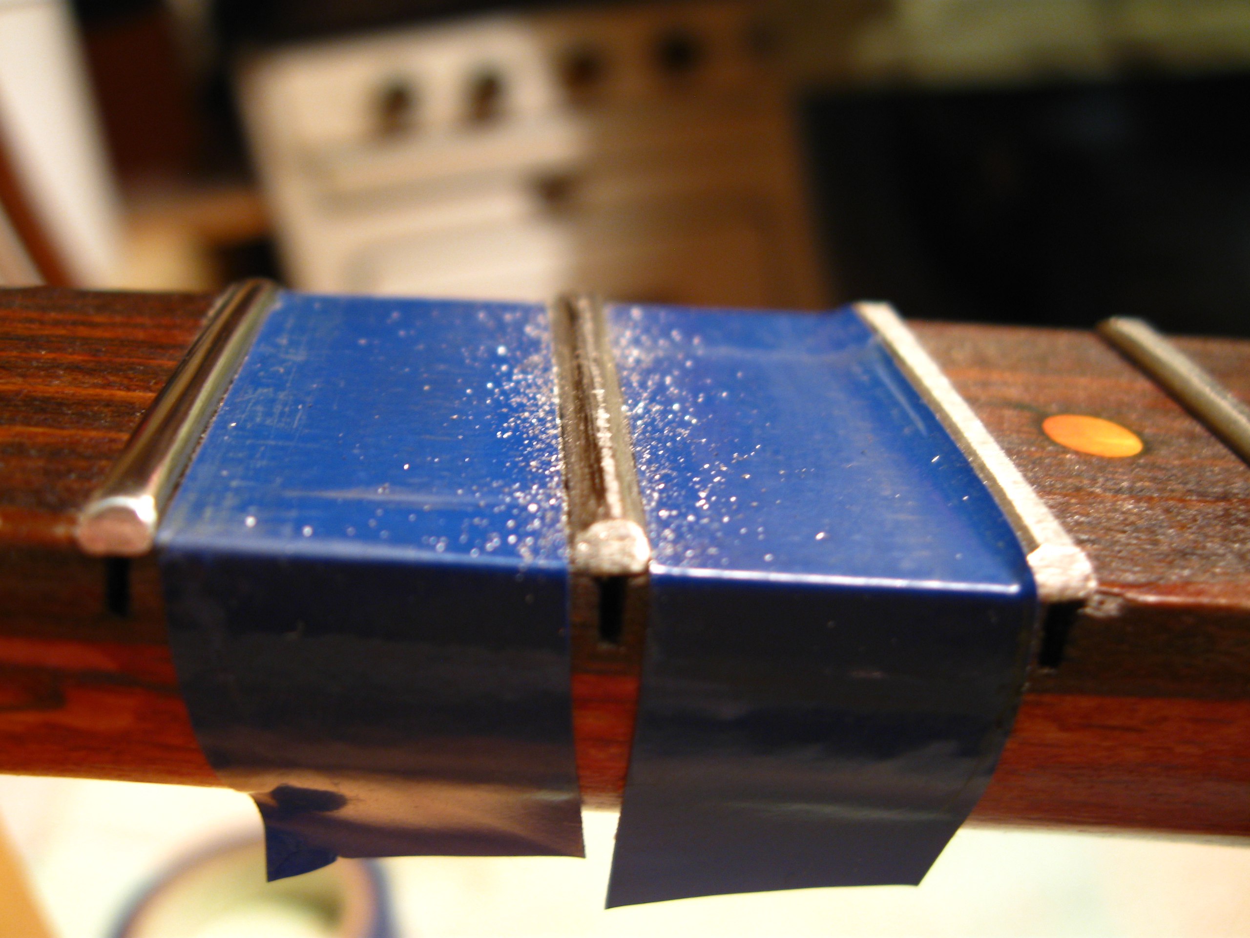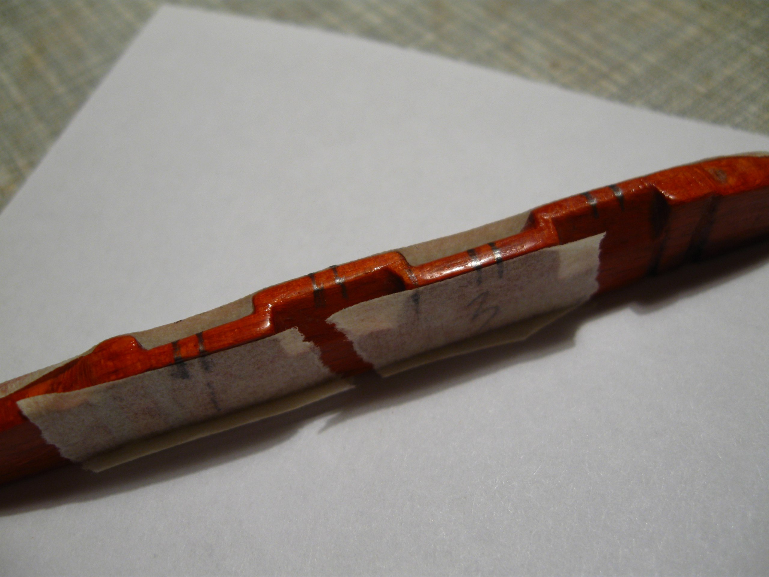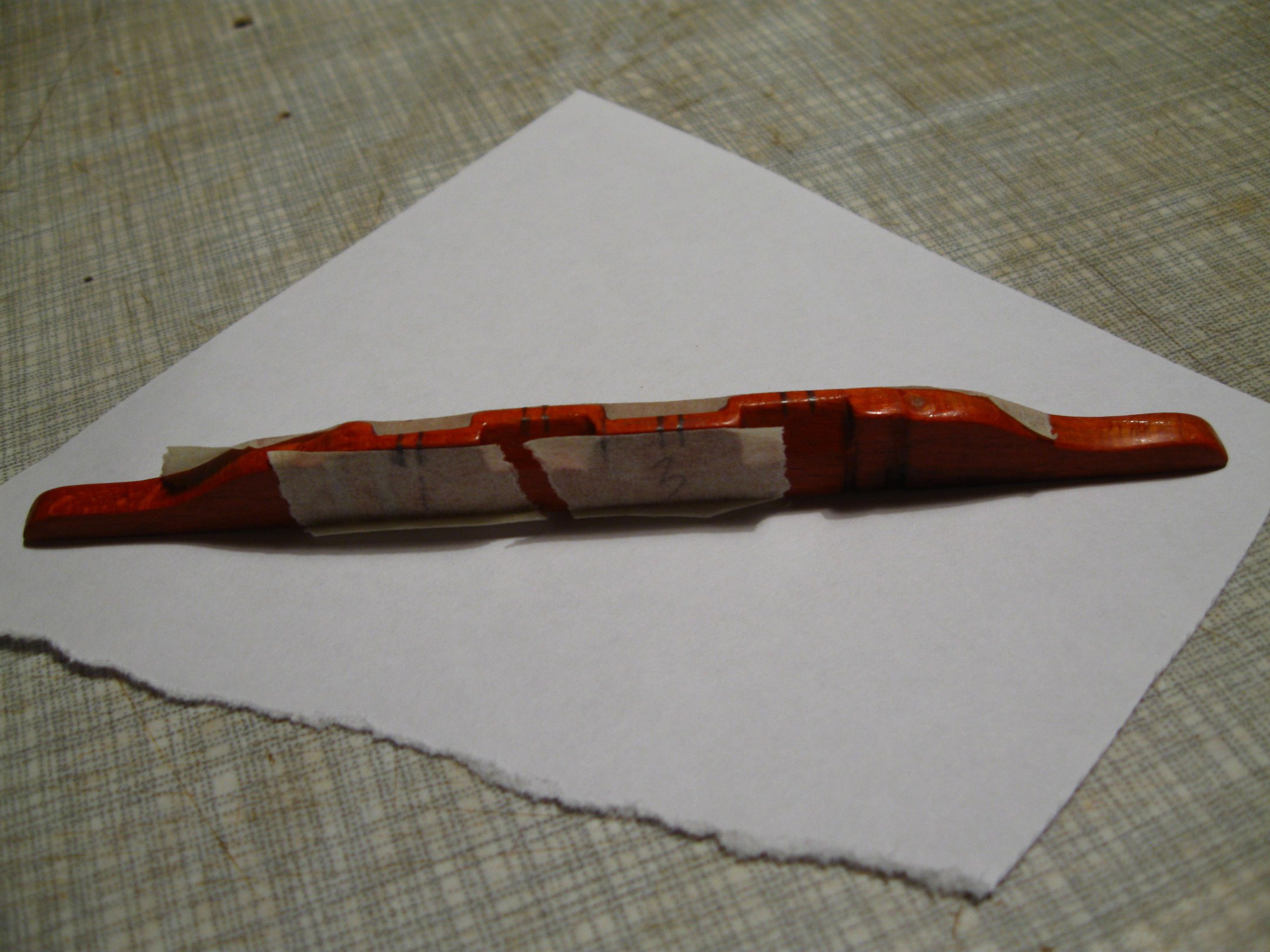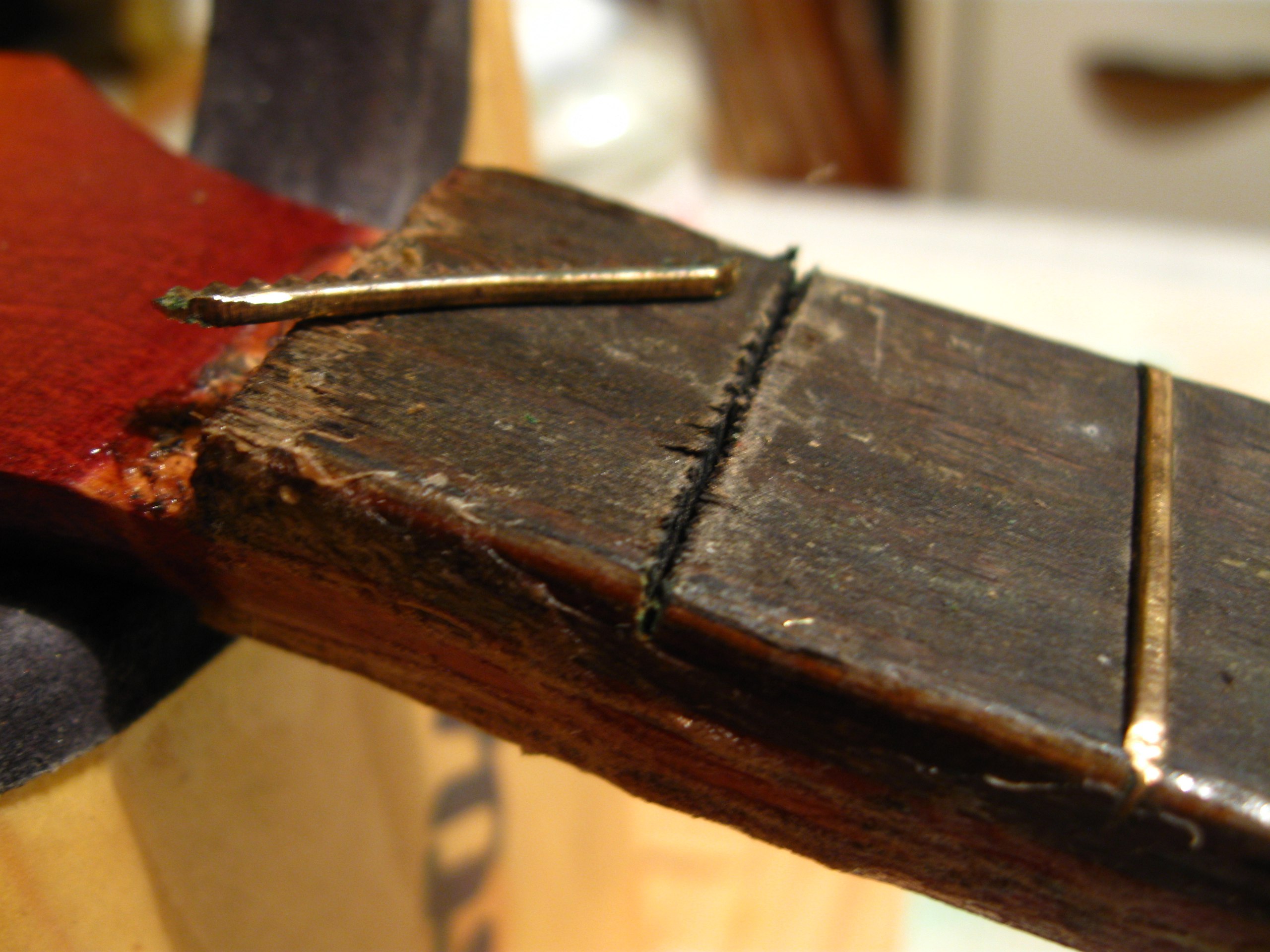 Поначалу думала спозиционировать башку 2 гвоздями, даже отверстия просверлила в пазе под 1й лад. Но как оказалось, они только мешали. Клеила так, причём ещё и башку на глаз выставляла. А вот и тот самый притир, который на гитару коротковат: