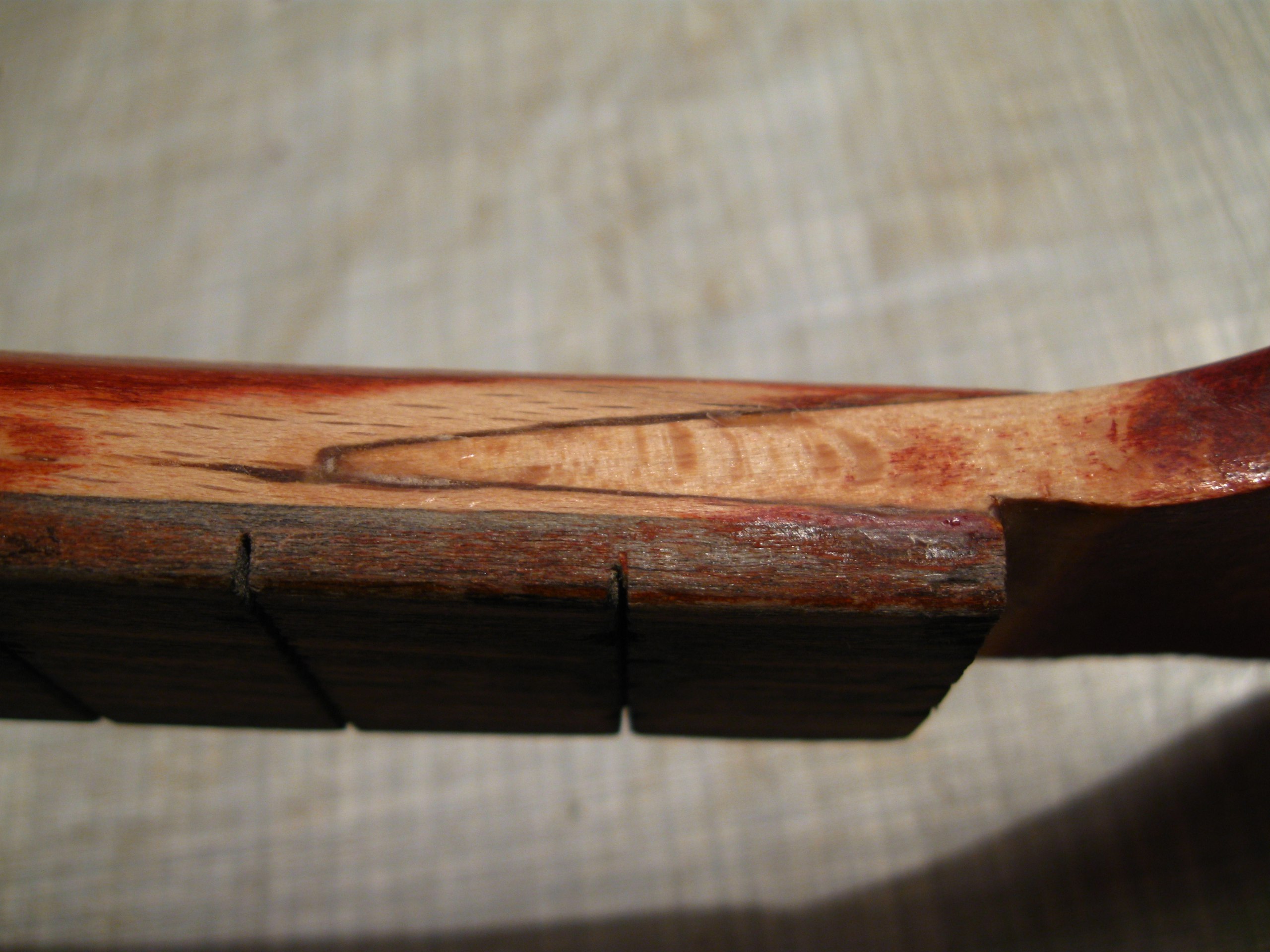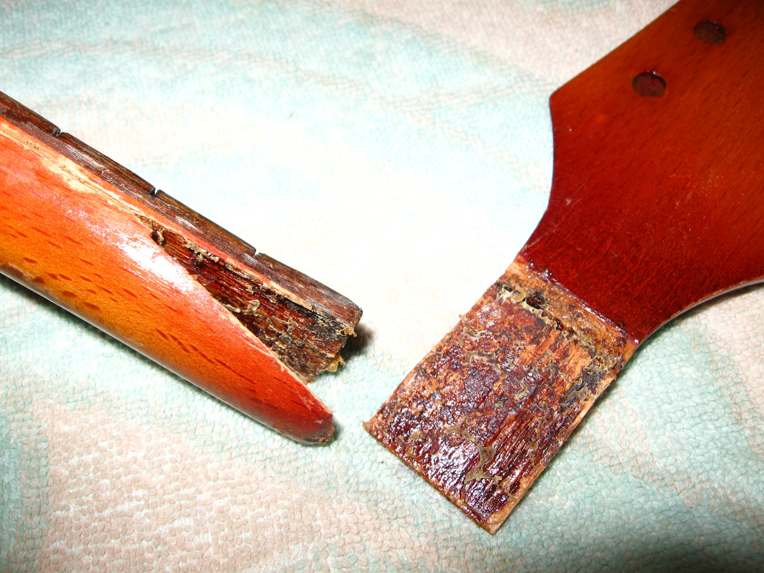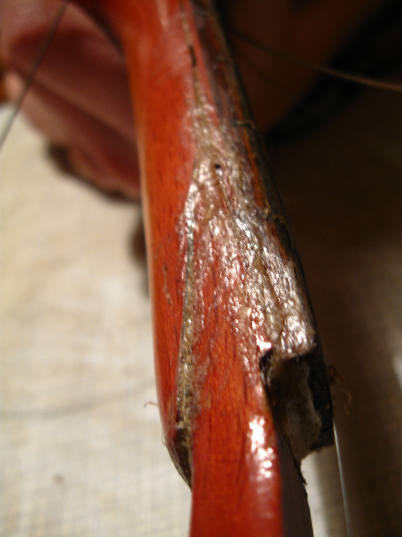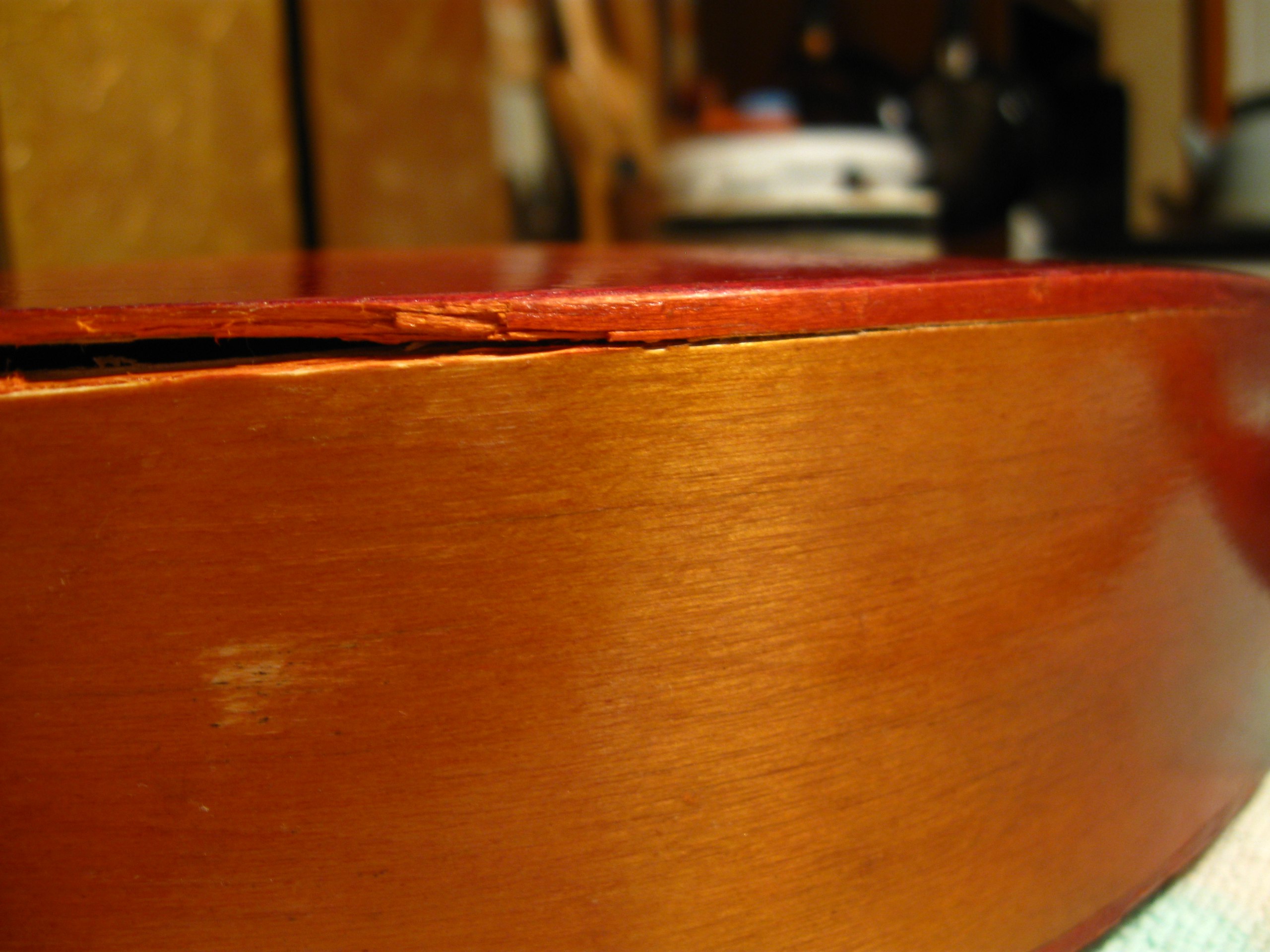 Тут нехватало кусочка на верхнем слое фанеры, а нижние были измочалены - судя по всему, сюда удар и пришёлся. Ничего страшного, супер и древесная пыль. Часть деки лишилась лака из-за снятия насёров момента, на фото уже подправлено так же, как и на грифе.