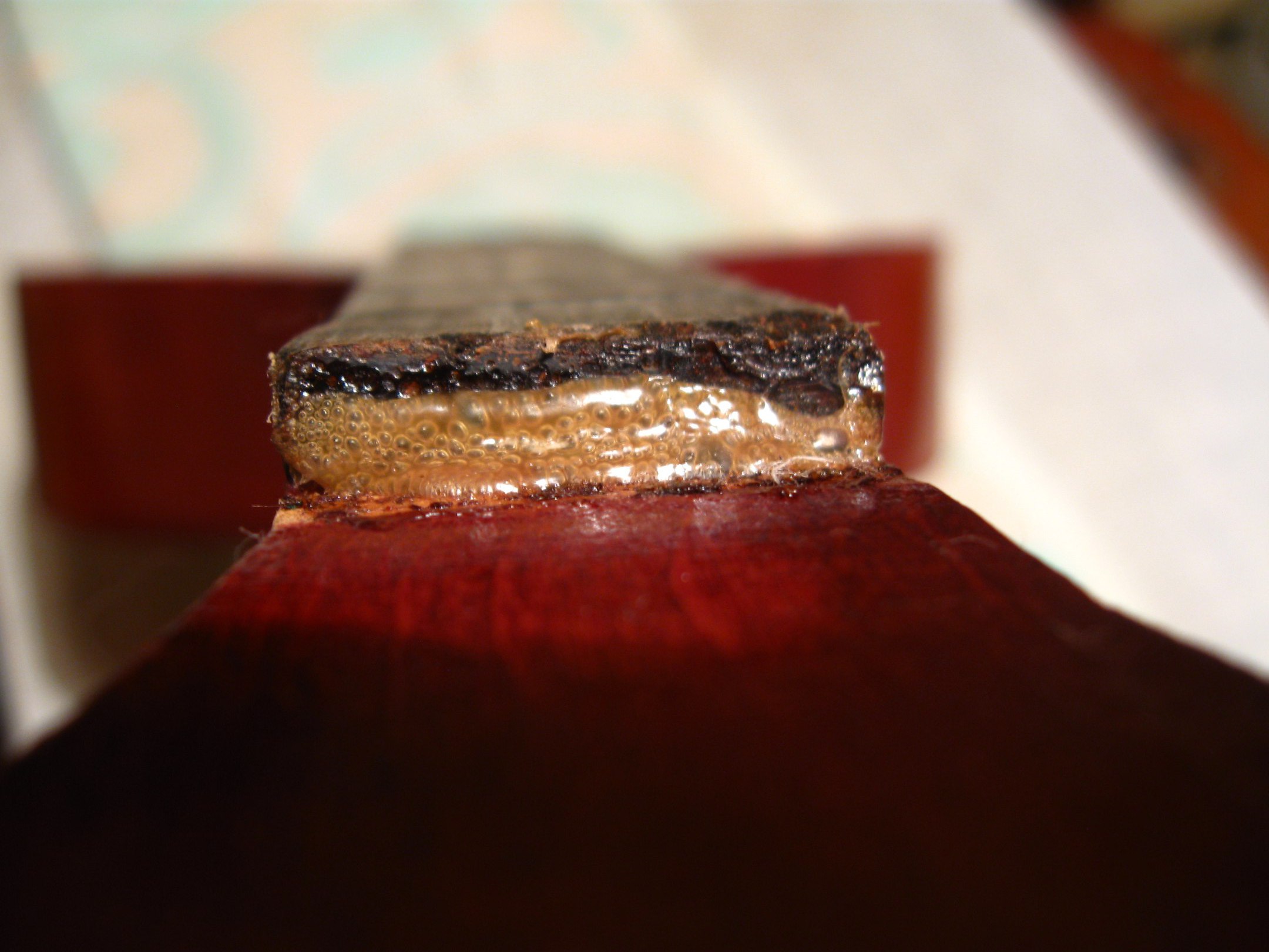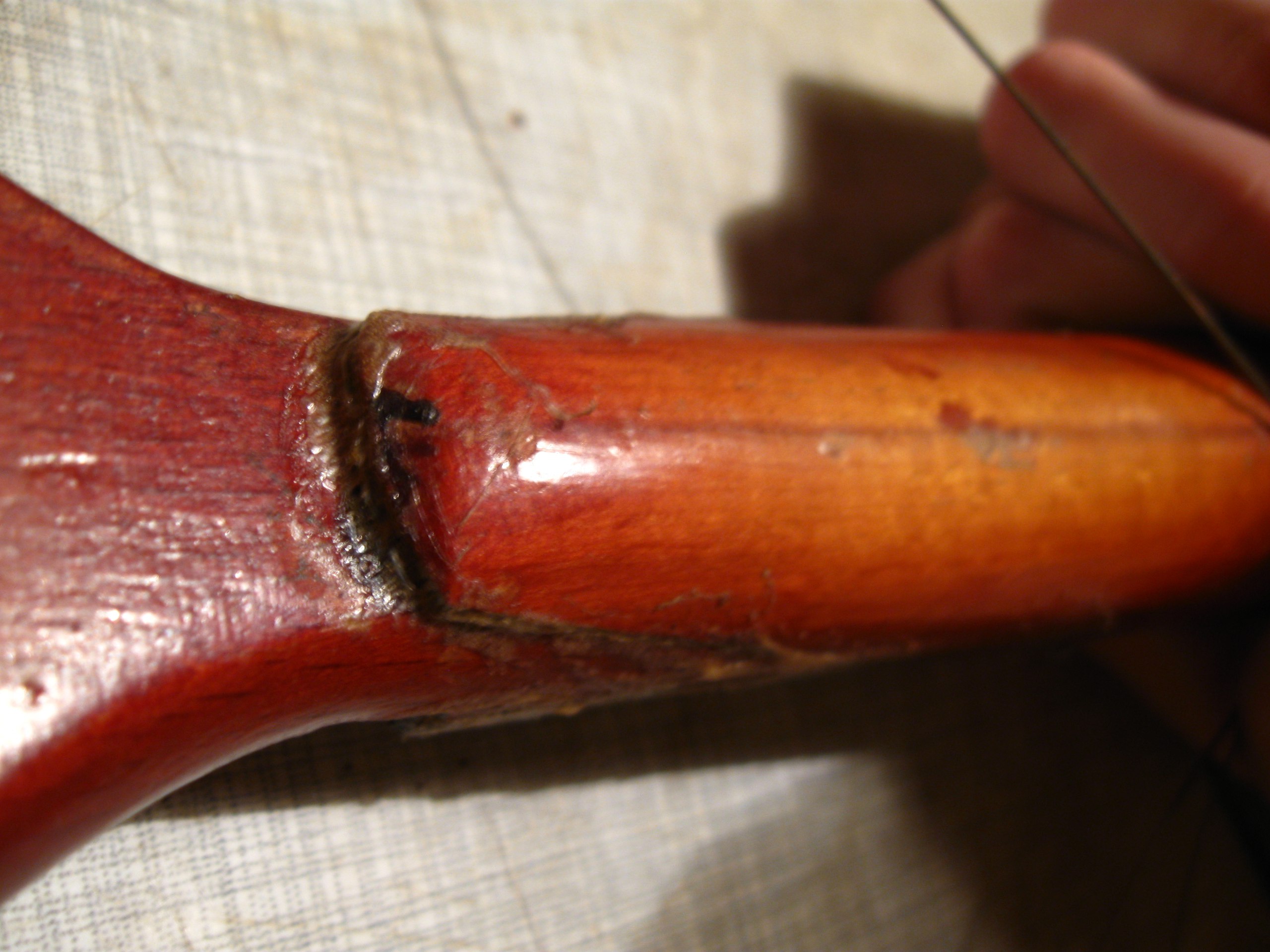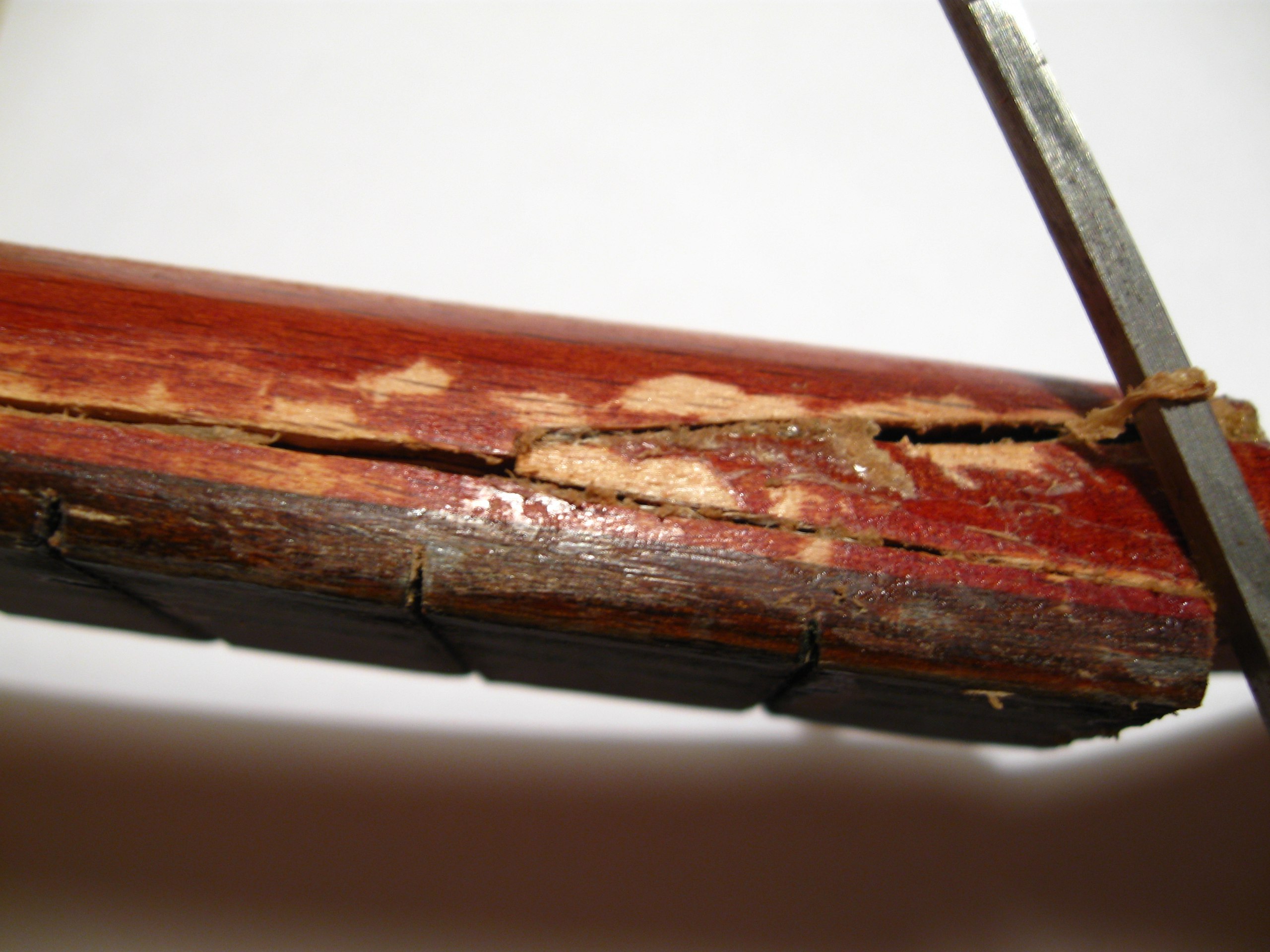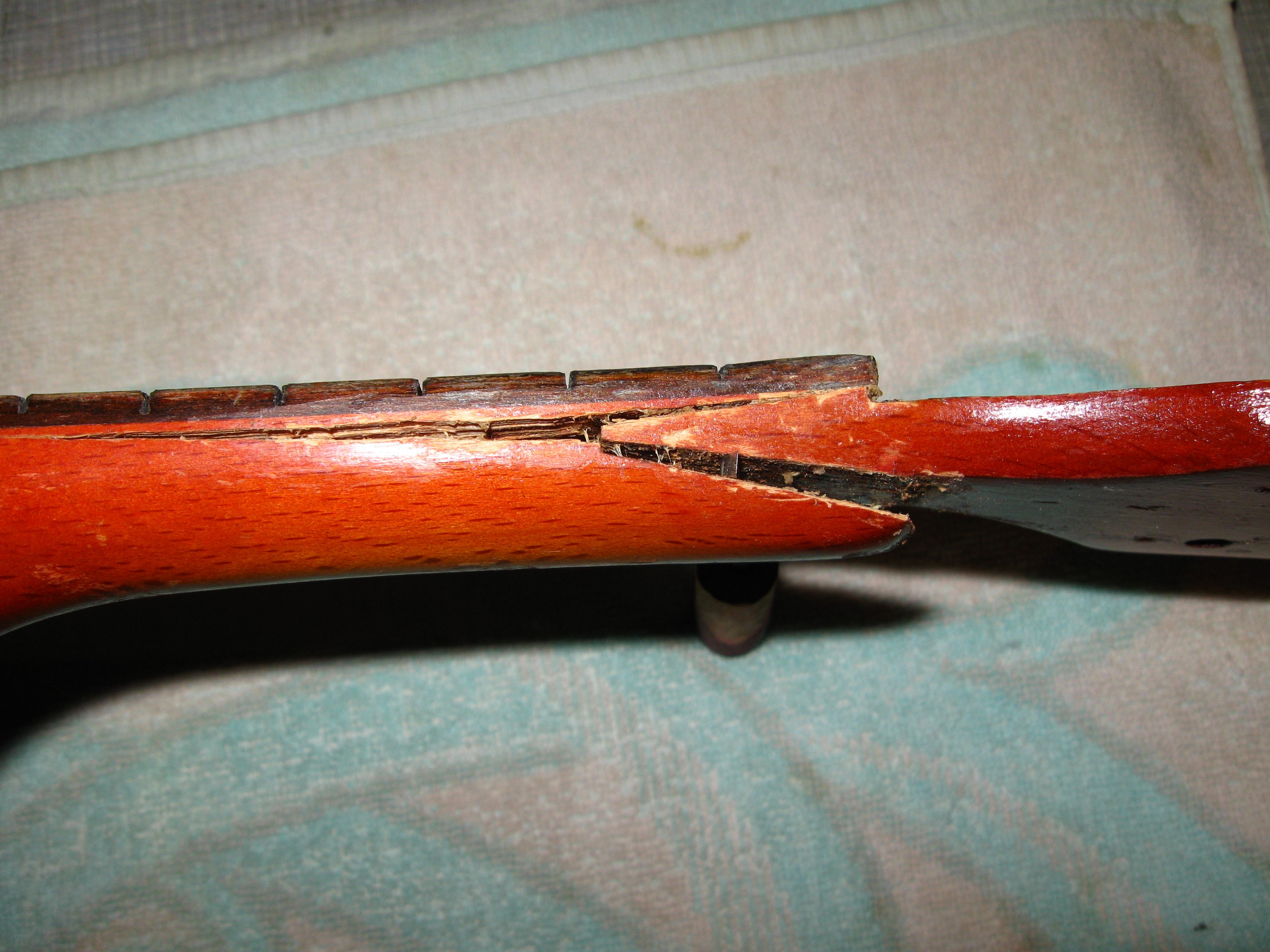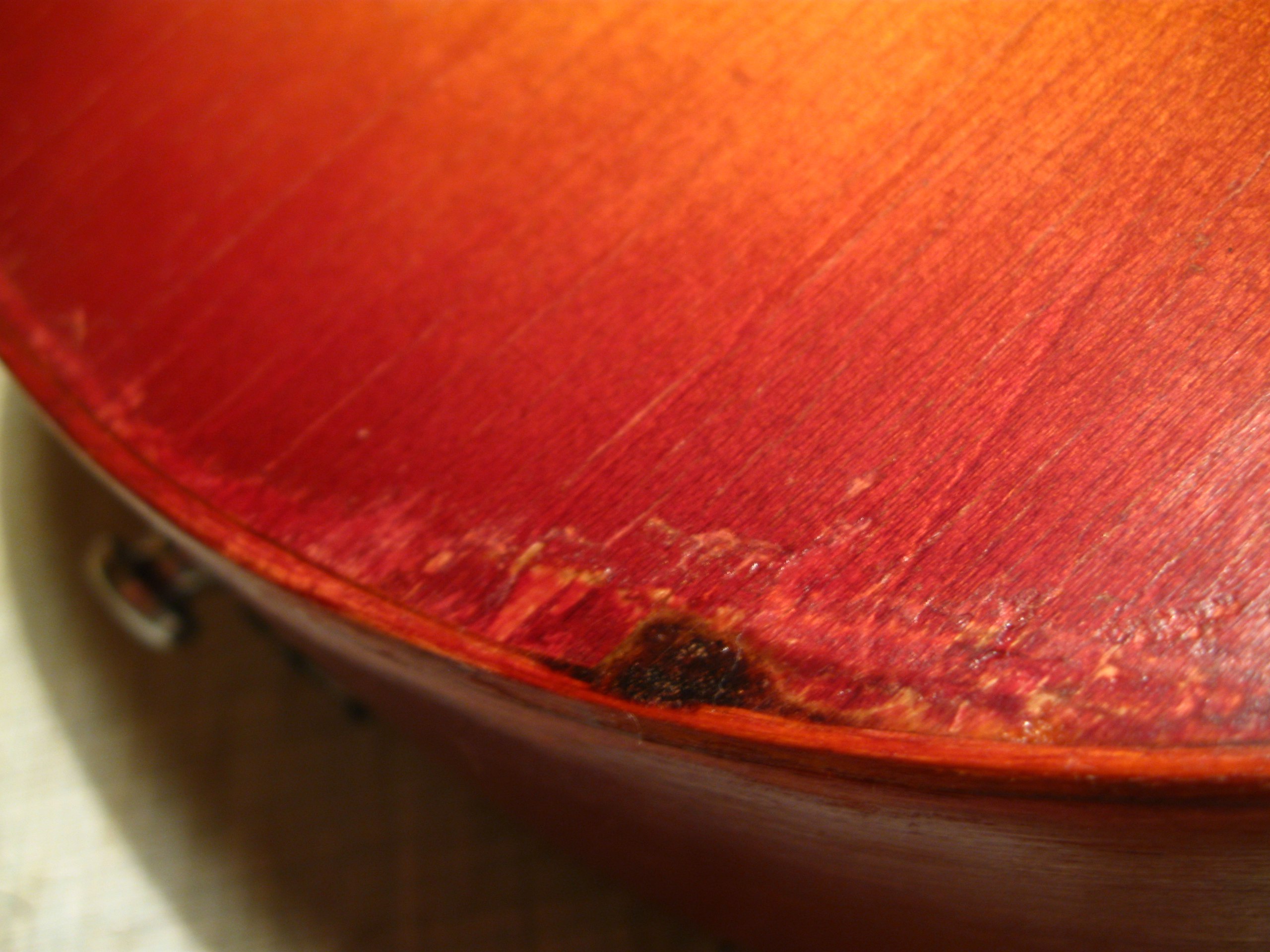 Тут нехватало кусочка на верхнем слое фанеры, а нижние были измочалены - судя по всему, сюда удар и пришёлся. Ничего страшного, супер и древесная пыль. Часть деки лишилась лака из-за снятия насёров момента, на фото уже подправлено так же, как и на грифе.