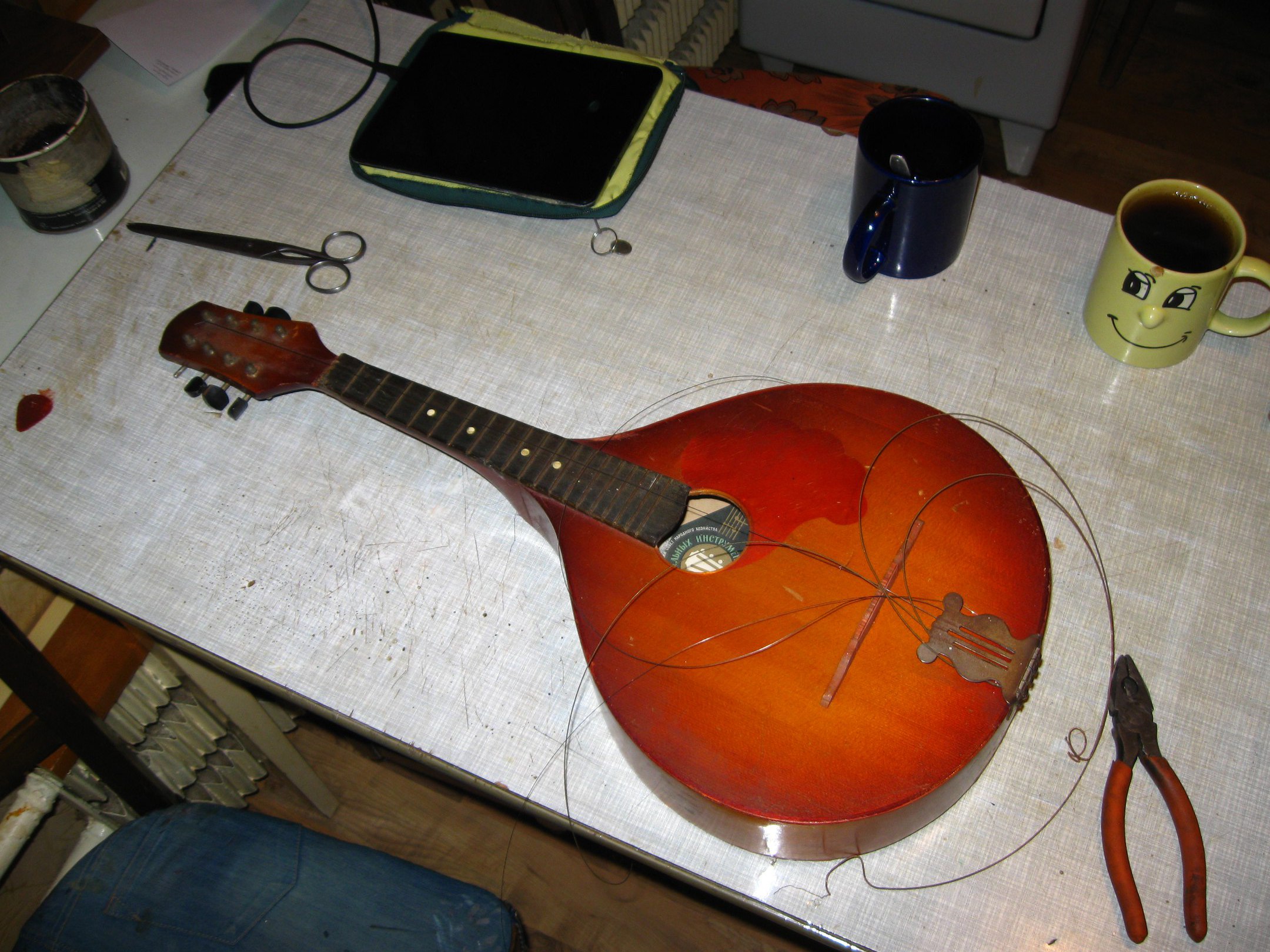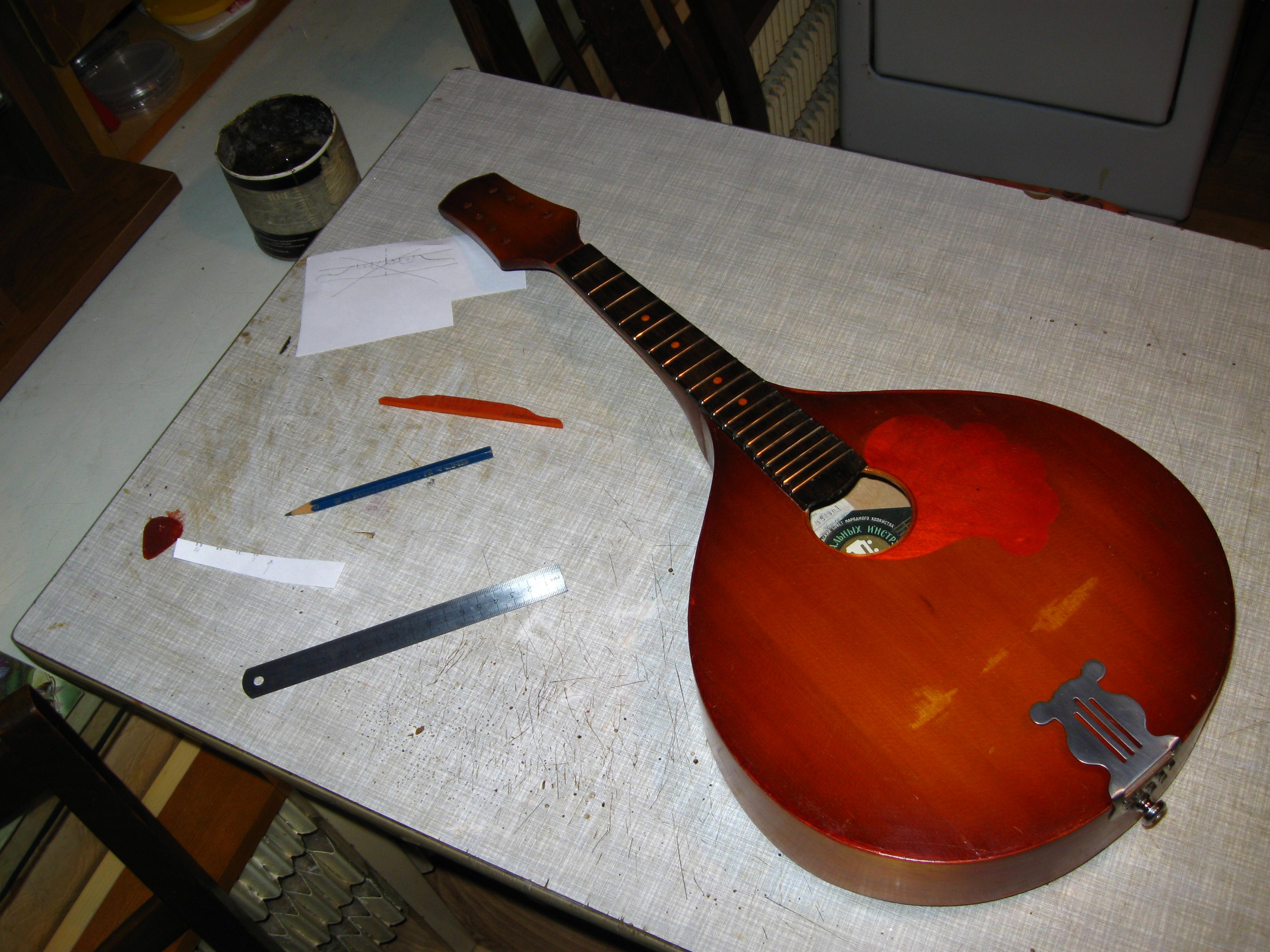 Ну что, приступим? Берём инструмент, чем уколхоженнее - тем лучше. Я нашла отличную луначарскую мандолину, густо перемазанную моментом и хранившуюся в большой влажности. И хрен бы с ним, если бы моментом было намазано только по лаку - нет же, надо было кому-то "клеить" им, затыкая в щели. Вот поцыент на операционном столе: