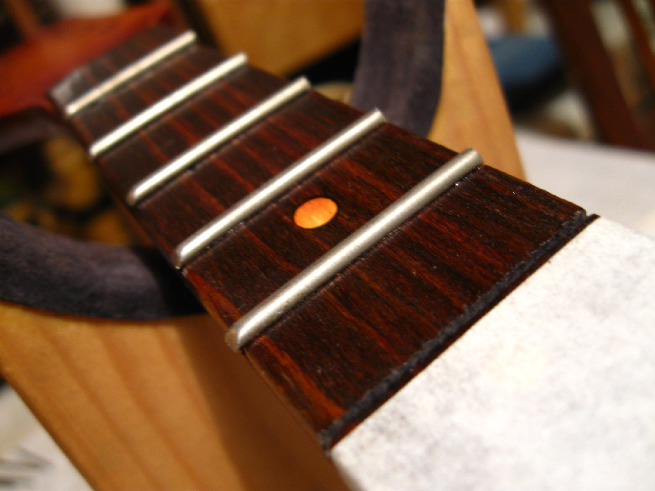 А мне всё лень фоткать, как я собираю корпуса по кусочкам, меняю лады и перевклеиваю грифы под нормальным углом. Печаль, да? Ну вот исправляюсь, целый 1 ремонт практически полностью отснимала на фото и уже готовый инструмент на видео. Да, не гитара. Но разница невелика - была б это гитара, просто пришлось бы чуть дальше отходить для фотографирования и при выравнивании накладки взять другой притир, подлиннее. А принципы ремонта, инструментарий и логика везде одинаковы.