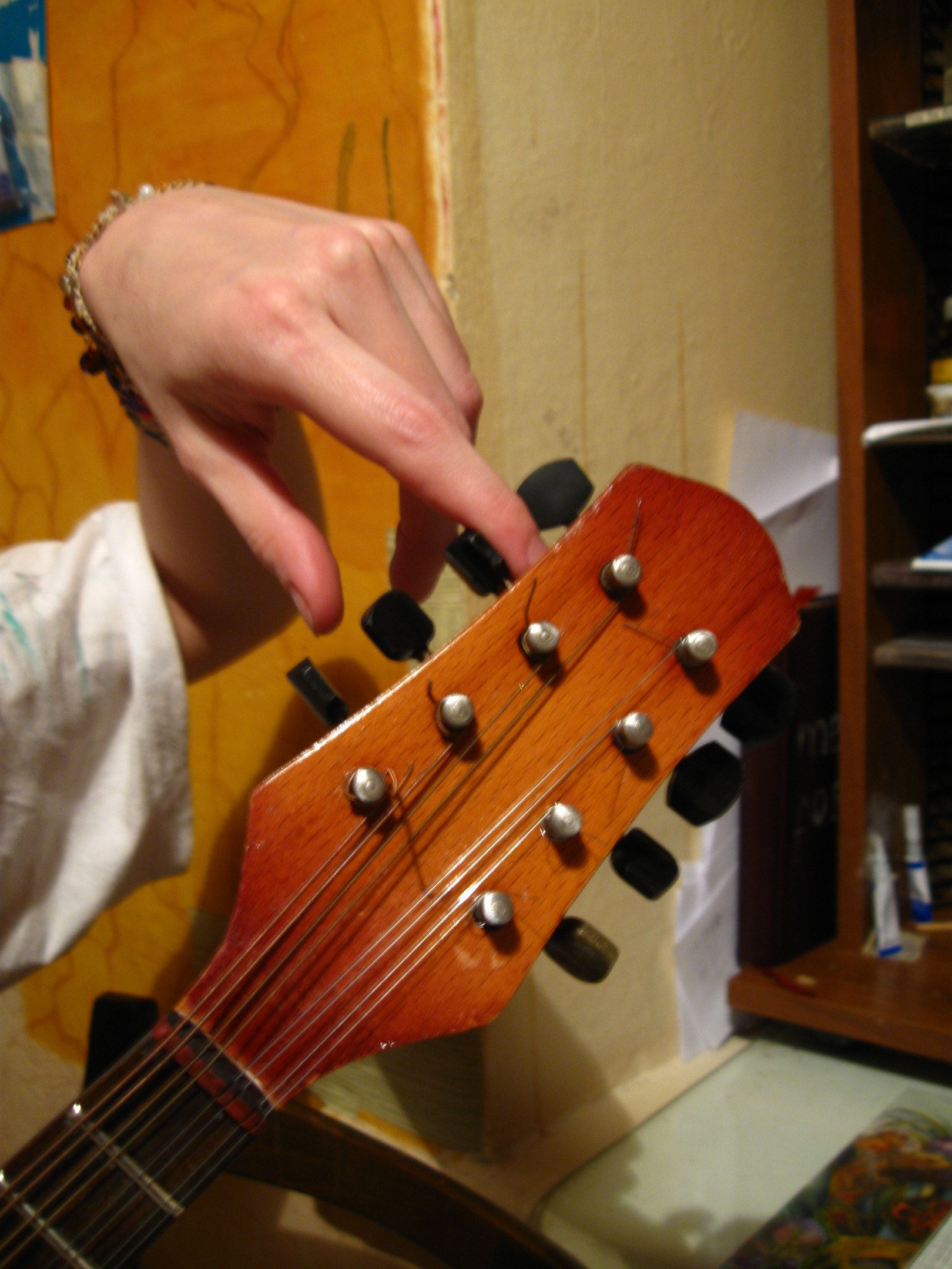 Да и вообще пока общий язык с ней не очень нашёл. После бас-гитары и гитары очень непривычно. Настроил по-скрипичному - совсем другая аппликатура аккордов. Как её запомнить? Настроил по-гитарному - всё так близко, что пальцы рядом не умещаются - очень мало места. Было уж пожалел, подумал, это ж все аккорды заново учить нужно, лучше бы тематический басок какой-нибудь приобрёл!... Но уж больно хороша мандолинка! Поэтому думаю пропилить верхний порожек, вернуть всё-таки родной скрипичный строй и на нём учиться играть потихонечку. Может и мелодию REM сбацаю! (а ваше видео будет в таком случае видеошколой ).