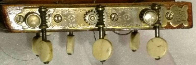 Ещё пример колковой планки с нанесенным рисунком от 130-летней гитары Циммермана, про которую говорится "могу утверждать точно - она была из "бюджетной" линейки" (источник содержит большое количество фотографий внутренности гитары - для интересующихся): [link] "Как обычно, перед натяжкой струн смазываю колки. Здесь я был просто потрясен! Это не колки, это Колковая Механика на уровне шедевра! Люфтов нет вообще, ход мягкий, на накладке ничего не разболталось, не покривилось! Ручки в идеальном состоянии! О мастер - ты Велик! Слава тебе в веках!!!"