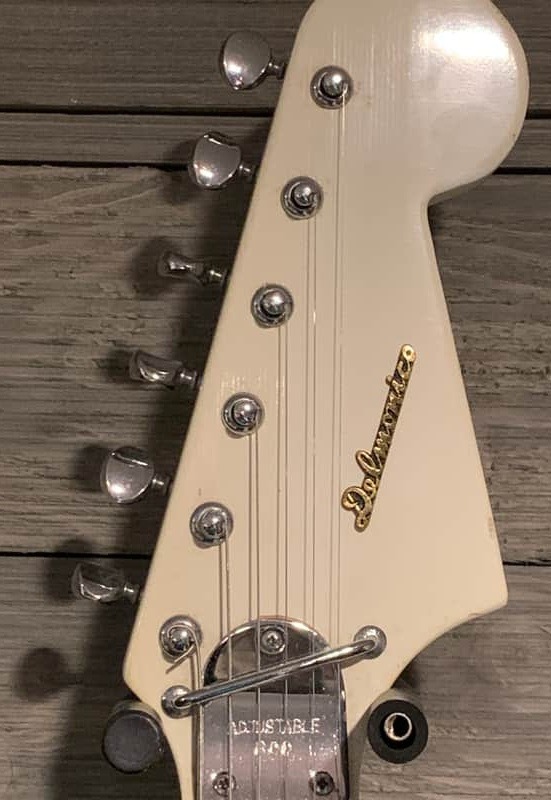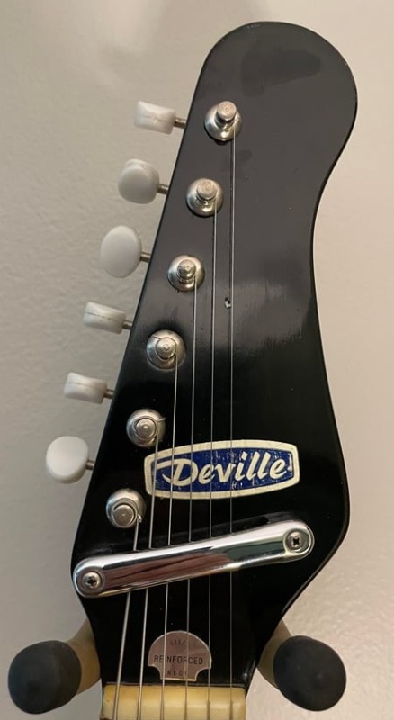 при этом она исключительно похожа на приведенную на 2-х фото ниже электрогитару бренда DECCA - однако у последней нет крышки анкера, другие звукосниматели и иное расположение винтов крепления струнозацепа с тремоло: