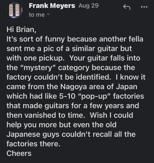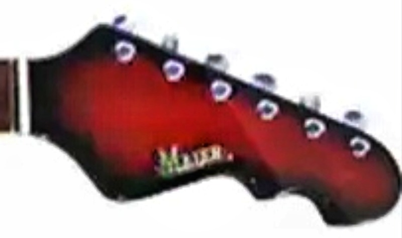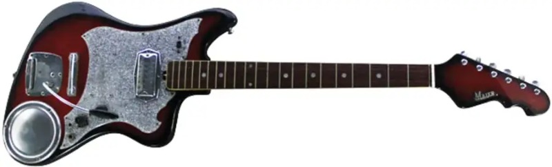 Очень похожий по слову "MAIER" на голове грифа, а также с похожей формой корпуса, инструмент с металлическим пикгардом и встроенным усилителем, описанный в уважаемом источнике как "таинственный" [link]