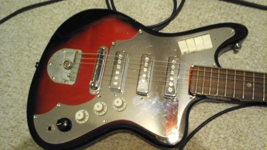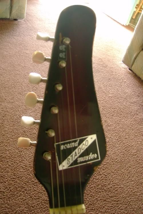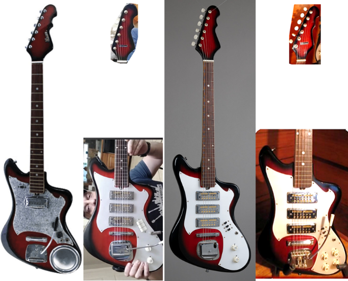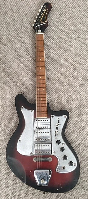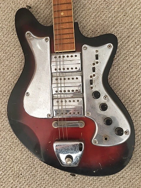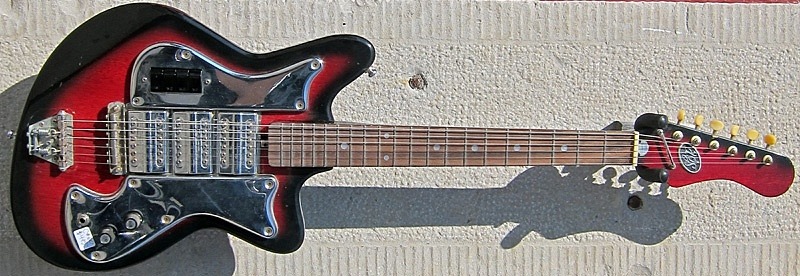 Что же до манеры размещения клавишного баяна вдоль оси верхнего рога грифа, то она имела место ещё и на изделия под брендами Lake и Stadco Sound Master, причём последний тоже имел характерный для Tele-star'ов "зуб" пикгарда, обращенный от ручек потенциометров в сторону струнозацепа того же типа, - как при 2-х, так и при 3-х звукоснимателях на борту: [link] [link] [link] [link] [link] Такая же электрогитара, как Stadco Sound Master с 3-мя звукоснимателями, но без указания бренда, оснащена сдвижными переключателями вместо клавиш: [link]