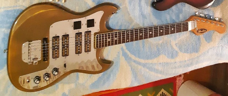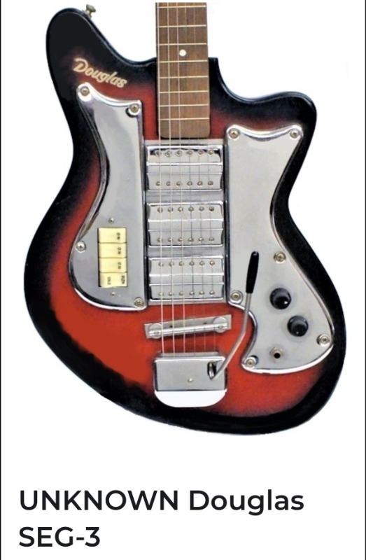 Линейка инструментов с металлическими пикгардами одинаковой формы, оснащенных звукоснимателями, разработанными когда-то фирмой COLUMBIA для производителя MATSUMOKU: японского бренда MELLOW TONE (c 2-мя), марки DECCA DMI 231 для 'экспорта в США (с 3-мя), неизвестного бренда (с 4-мя).