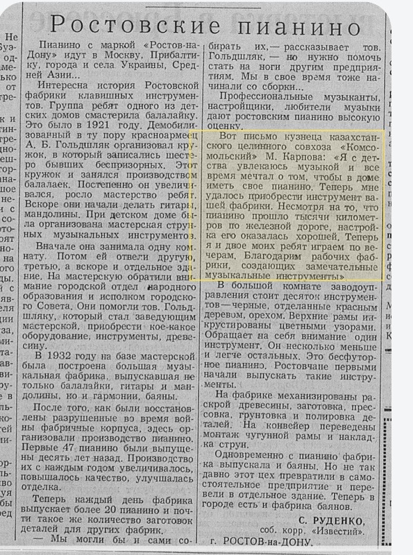 "Известия", 7 декабря 1957, с. 4 - в том числе и про довоенную историю Ростовской фабрики клавишных инструментов, и про послевоенное отделение баянного цеха в самостоятельную банную фабрику: [link] Мы порой, с волками споря, Воем в си-бемоль-миноре...