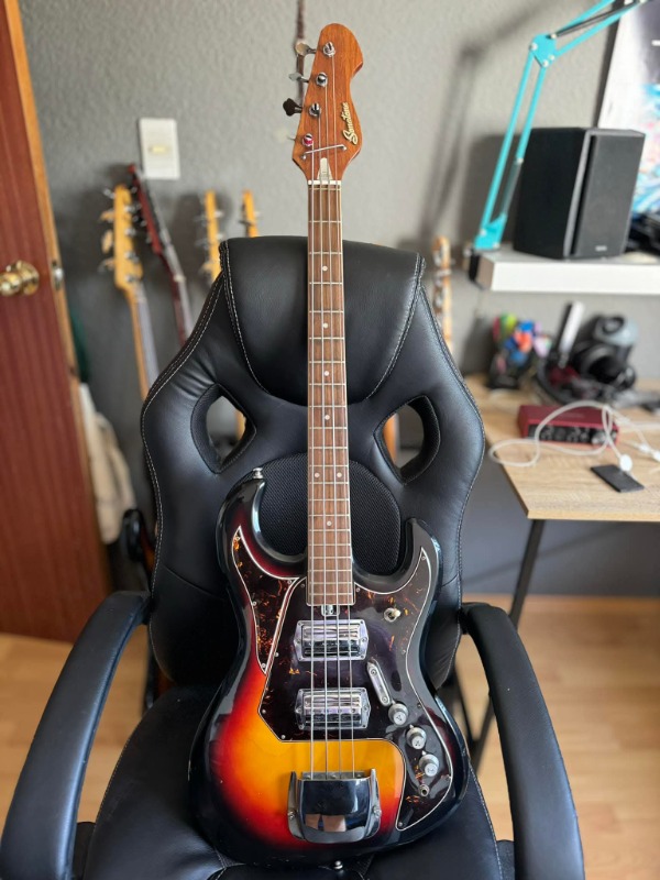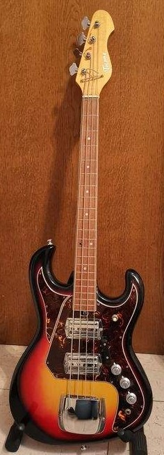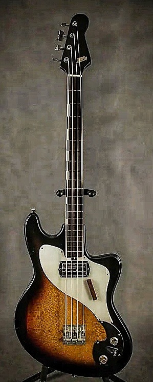 | [link] Silvertone Electric bass model 57 H 01490L Бас-гитара 1490 была настоящим монстром, клоном Fender, импортированным к нам в рамках японского «вторжения» конца 60-х. Когда эра Dano подошла к концу, началась эпоха Made In Japan с появлением гитар MIJ осенью 68-го. 1490 отличалась внушительным внешним видом, гигантскими звукоснимателями и стильным многокомпонентным пикгардом. Интересно, что в каталоге также указан «демпфер». Как и «Country Gentleman» 1475, эта гитара, похоже, была выпущена на фабрике в Мацумоку. Представлена [в каталоге Sears]: осень/зима 1968 года под индексом 57H1490L по цене 77,95 долларов (первоначально кейс входил в комплект, в 1970 году кейс стал опцией). Снята с производства (последний раз замечена): 1972. __________