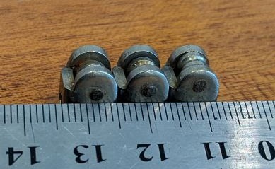 3. Цилиндрические пластмассовые. Данные ручки также являются приборными. Изготовлены из пластика серого или чёрного цвета. На небольшой юбке имеет указатель положения регулятора. Фиксация на штоке резистора обеспечивается при помощи скрытого винта. Сверху отверстие в ручке закрывается декоративной крышкой. Такие «крутилки» встречаются на отдельных инструментах № 12ххх-13ххх. Цилиндрические приборные ручки на «Аэлите» № 12390