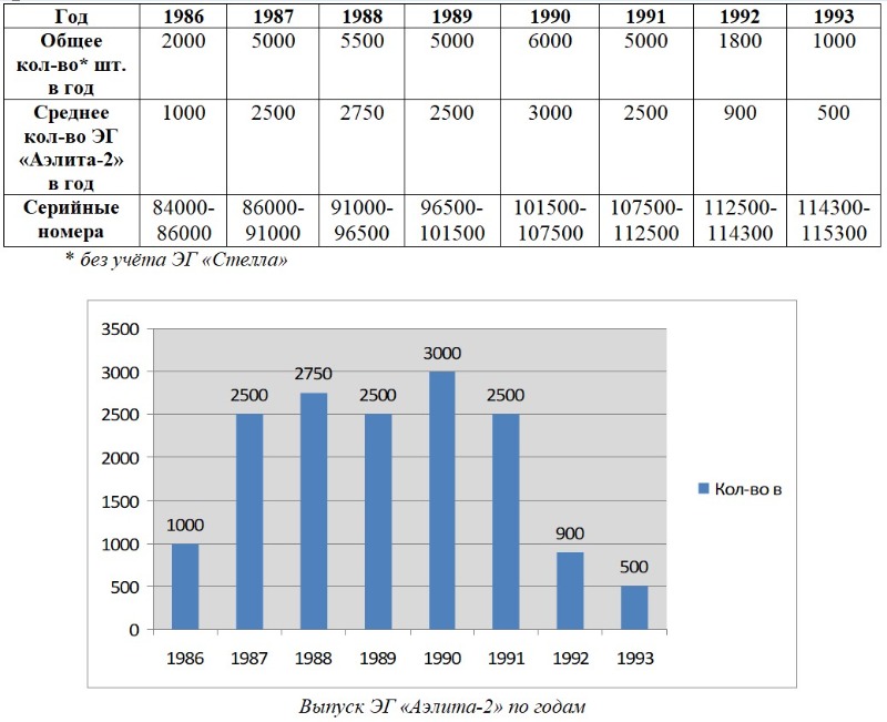 Электрогитара «Аэлита-2» выпускалась в период с начала 1986 до начала 1993 года. Самая ранняя из известных гитар имеет № 84412, самая поздняя – № 115047. В этот период одновременно с «Аэлитой-2» на фабрике клавишных инструментов серийно выпускались: бас-гитары «Бас» (до № 94700) и «Бас-2» (№№ 94000-11500), которые имели общую нумерацию с «Аэлитой-2». Также на фабрике выпускалась ЭГ «Стелла» с собственной нумерацией, выпуск которой в указанный период составил ориентировочно 15000 шт., и бас-гитара «Бас-3», мелкосерийным тиражом которой можно пренебречь (около 300 шт.). Принимая во внимание информацию об известных паспортах на указанные выше инструменты, даты выпуска темброблоков, сопоставление материалов пикгарада и усредненное соотношение электрогитара/бас-гитара как 2/1, получаем следующие расчётные данные по выпуску электроинструментов: 115000-84000=31000 шт.+15000 («Стелла»)=46000 шт (всего)/3= ~15000 шт «Аэлита-2». Но это расчётные данные, которые входят в некоторое противоречие с анализом информации по известным моделям клавишной фабрики этого периода. На момент написания статьи доля известных ЭГ «Аэлита-2» существенно превышает количество известных бас-гитар. Этому могут быть определённые объяснения, но полагаю логичным предположить, что всего было изготовлено 15000-20000 экземпляров ЭГ «Аэлита-2». Ниже приведена сводная таблица выпуска электроинструментов на клавишной фабрике «Ростов-Дон» в период с 1986 по 1993 годы (расчётные данные):