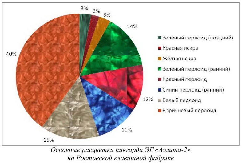 Окраска и расцветки пикгарда Способы окраски расцветки ЭГ «Аэлита-2» не имели отличий от своей предшественницы. Гитар окрашивалась чёрным полиэфирным лаком на всём протяжении выпуска. Голова грифа целиком окрашивалась в цвет грифа и не имела декоративной пластиковой накладки. В период освоения производства первые инструменты могли быть окрашены в красный цвет по аналогии с поздними «Аэлитами», но количество таких гитар мизерно, и они являются настоящей редкостью. Расцветки пикгарда типичны для советских электрогитар времен позднего СССР.  Первые партии гитар унаследовали от поздней «Аэлиты» пикгарды из искристого пластика жёлтого и красного цвета, но очень быстро (после № 86400) им на смену пришёл белый перлоид, а после № 90000 к нему присоединились перламутровые расцветки красного и коричневого оттенка, а также яркие контрастные цвета зелёного и синего (редко) перлоида. В период №№ 100000-110000 синий перлоид не используется, а доля зелёного составляет не более 20%. Основное господство в этот период занимают перлоиды коричневого и красного цвета различных узоров. С № 110000 до № 113000 зелёный пластик практически не используется. Красный перлоид перестаёт встречаться на инструментах после № 111000. После № 113000 вновь появляется перлоид зелёного и синего цвета, но уже иного оттенка. Вместо сочных контрастных ранних расцветок появляются пластики тёмных невыразительных тонов. Ниже приведены основные расцветки пикгардов ЭГ «Аэлита-2» в хронологическом порядке: