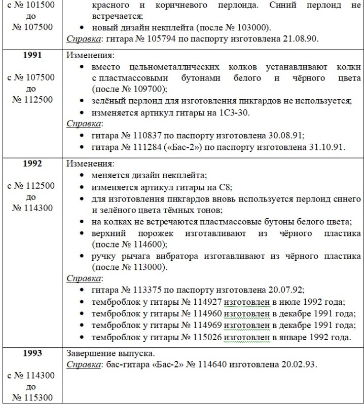 Выводы: 1. Выпуск ЭГ «Аэлита» осуществлялся равномерно, за исключением 1986 года (освоение производства) и 1992 года (окончание выпуска). 2. Почти половина электрогитар имели пикгард, изготовленный из различных вариантов перлоида коричневого цвета. 3. Половина выпущенных инструментов имели звукосниматели с металлическим корпусом. 4. Почти на 90% ЭГ «Аэлита-2» установлены цельнометаллические колки. 5. Почти 70% выпущенных гитар имеют артикул 2451р.