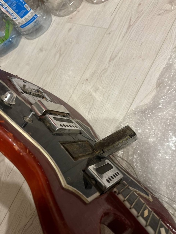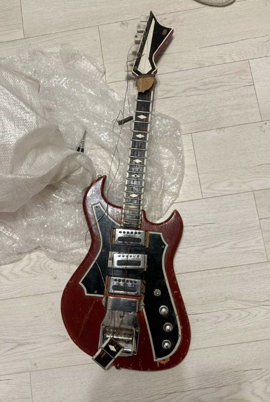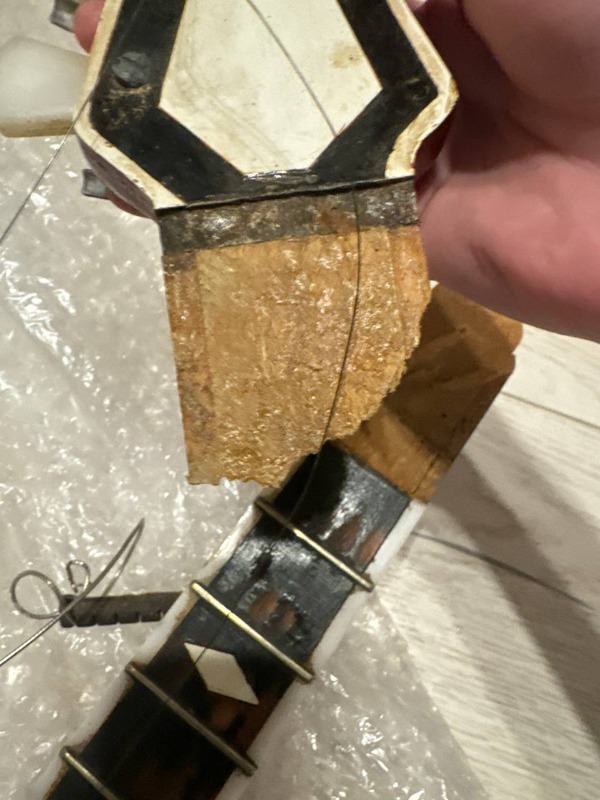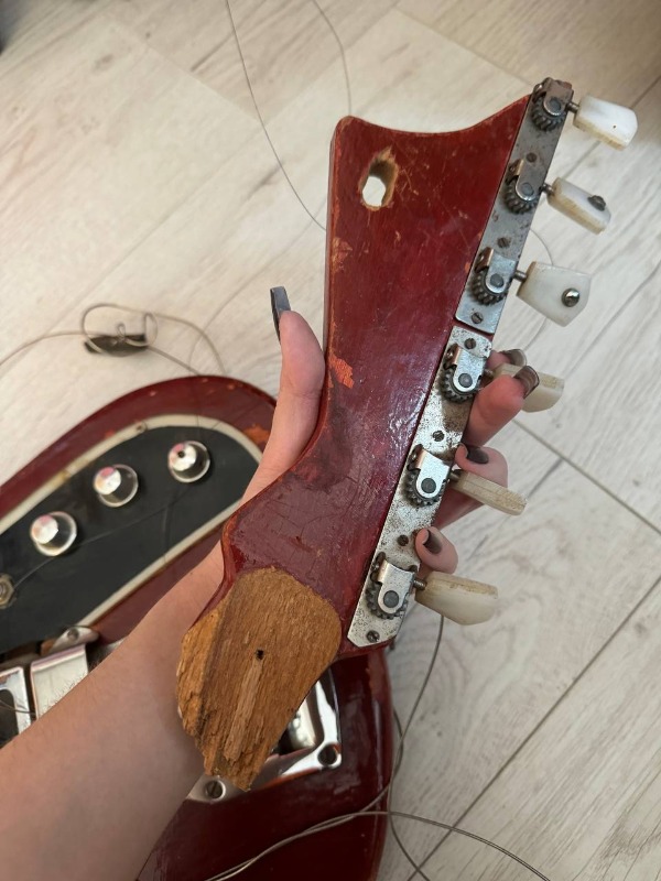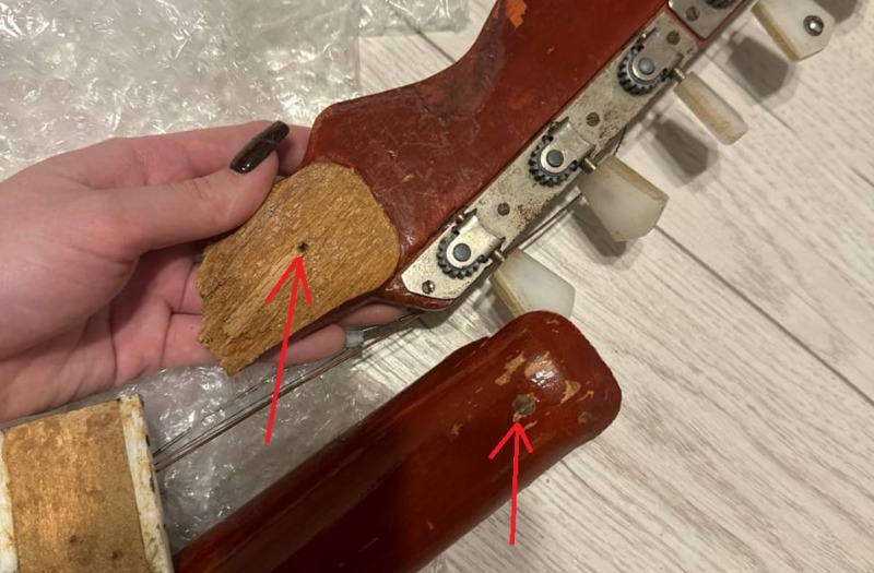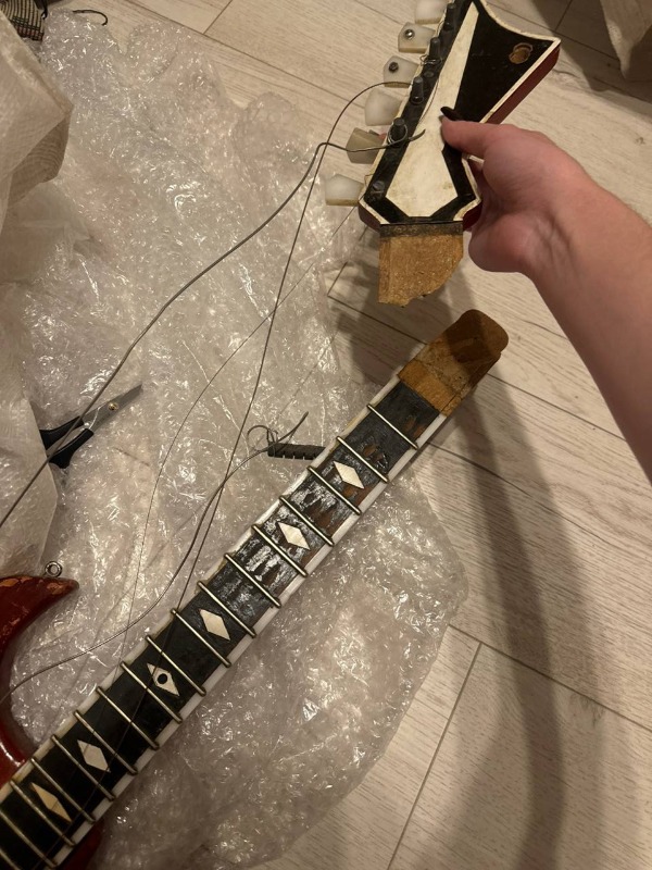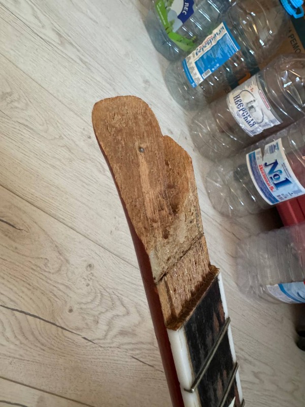 | Купил я по итогу это диво дивное. Гитара не выдержала бережного отношения со стороны СДЭК при пересылке. Голова грифа подумала-подумала и отлетела к чертям. А вместе с ней верхний порожек и часть накладки. Но я не унываю, это всё поправимо.