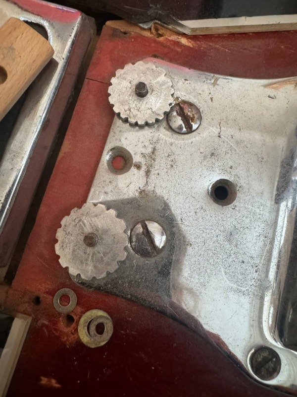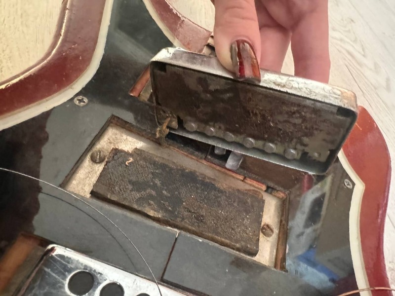 При вращении корпуса выпал из своего посадочного места средний звукосниматель. По фоткам продавца мне не было понятно, как крепятся звукосниматели. По всем канонам они должны крепиться к пикгарду с обратной стороны двумя шурупами. Но нет! Они крепятся на клей к резиновым прокладкам! А пикгард состоит из двух частей и выполняет скорее декоративную функцию. Даже потенциометры крепятся за сам корпус. Этому свидетельствует отсутствие винтов крепления на пикгарде или же опорных гаек под ручками.