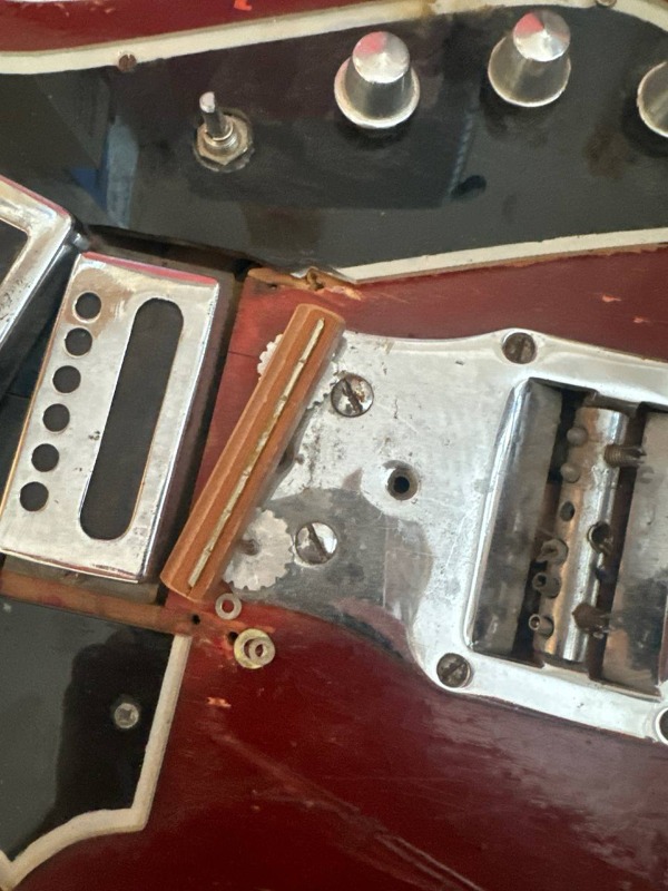 Средний датчик, судя по форме крышки, свердловский, а остальные это имитация под него. Может даже просто муляжи. Струнодержатель тоже свердловский (по некоторым признакам), но шпильки бриджа, судя по фото, не родные М3, но и не ростовские М5. На фото выглядят скорее как М4 (как на "Уралах"). Учитывая тотальную самопальность, может стоять что угодно. Тем более, что штатные шпильки расположены по краям, а тут сдвинуты к центру. Не удивлюсь, если выяснится, что и сам струнодержатель от "Музимы"