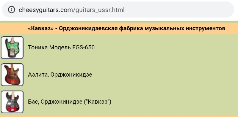 На сайте cheessyguitars в разделе, посвященном фабрике музинструментов в Орджоникидзе представлено три инструмента - Тоника классичного дизайна, Аэлита и бас дизайна неклассичного. И если принадлежность двух последних инструментов вызывает сомнение (уж больно много сходных с Формантой элементов), то с Тоникой, вроде, все ясно. Так вот вопрос - а может ли быть такое, что фабрика, входящая в объединение "Кавказ", выпускала только одну Тонику, когда Ростовская фабрика делала Аэлиту, бас Кавказ, Стеллу и прочие красоты гитаростроения. Мне кажется, ассортимент фабрики в Орджоникидзе не ограничивался инструментами, приведенными на сайте. Считаю, что отличительным признаком инструмента из Орджоникидзе является некплейт из жестянки с порядковым номером. У Тоники, которую относят к инструментам из Орджоникидзе на сайте cheesyguitars некплейт именно такой, в отличие от ростовских некплейтов, где все подробно расписано. Так вот, с жестянками у меня имеется бас Кавказ и Аэлита, и их принадлежность к ростовской фабрике я ставлю под сомнение. И если с жестяным некплейтом - это мои домыслы, то как вы объясните, что одна фабрика, входящая в производственное объединение, изготавливала шесть моделей гитар (ростов), а вторая три, две из которых как-бы под сомнением. Ваши соображения? "Восточный блок" - база гитарной фурнитуры и запчастей [link]
