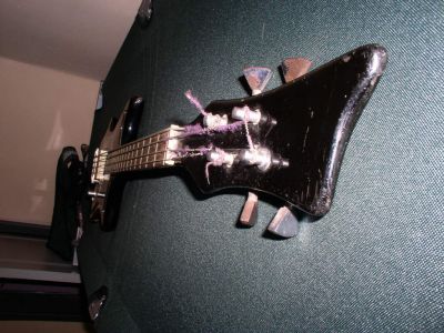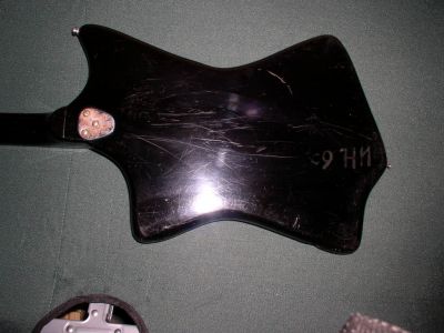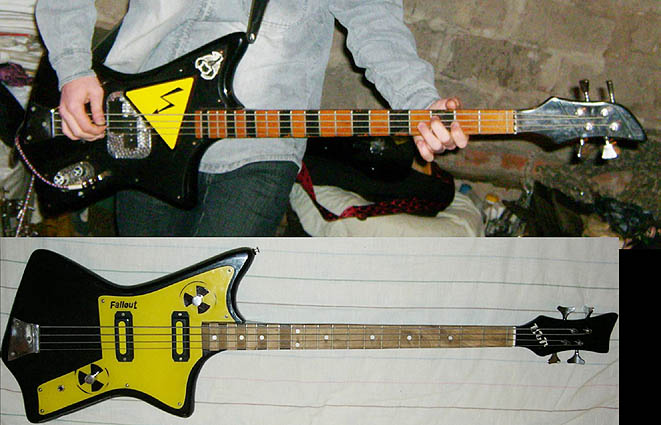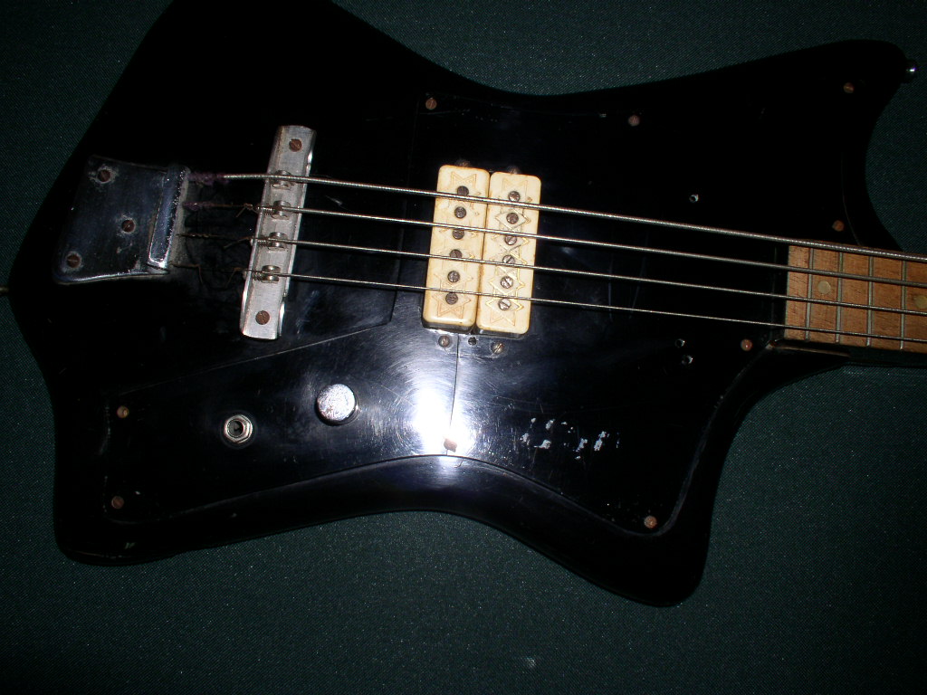 Это чудо советского басостроения было добыто сегодня Дека представляет собой эксклюзивную эргономичную дизайнерскую задумку - мечта трэш-металиста как я понял бывший владелец рубил трэш мэтал на нем поэтому родные "звукачи" были заменены на "хамбакер" от гитары урал для того чтобы нефонило !!! вместо ручки тембр было вставлено гнездо типа джек для этого была пропилена дыра в пикгарде от чего тот и лопнул пикгард представляет собой оргстекло покрашенное в чорный колор с тыльной стороны -оригинал! бридж - мастеровой нержавеющий колки родные немного ржавые (советская фурнитура ржавела даже в солидоле:) гриф!!!! ровный !!!! в руку ложится как черенок от лопаты 100%, анкер при внешнем осмотре обнаружен небыл, удивил маркер на 10 ладу почемуто остатки инвентарного номера на деке это уже классика жанра. вот и всё пока