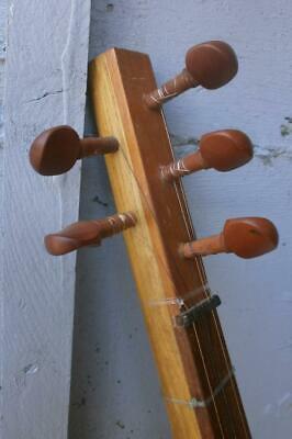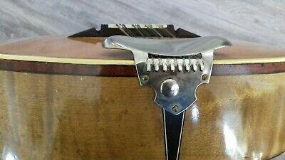 Вопрос: родной ли бридж (?) возник при просмотре других мандолин той же "модели"... А на приобретённой явно видна несимметричность в толщинах и кривизне обводов бриджа, хотя на фото выше это не так очевидно. Также возникает вопрос, одна ли ф-ка им.Луначарского выпускала такой модельный ряд? Даже если и да, то подозреваю, что творческая свобода мастеров мало чем ограничивалась: ни ГОСТ, ни ТУ, ни артикула не обнаружил на этикетке мандолины, что выше, пока в руках держал. Для сравнения приведу фото другой похожей мандолины с сайта объявлений, но продавец был неконтактный и фотографировать ничего не стал. Орнамент другой, зацеп другой, расцветка клёпок другая, лопасти колков (если это луначарка вообще