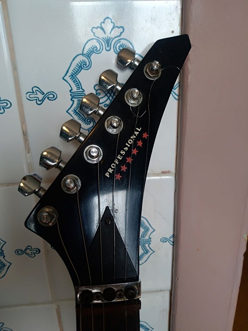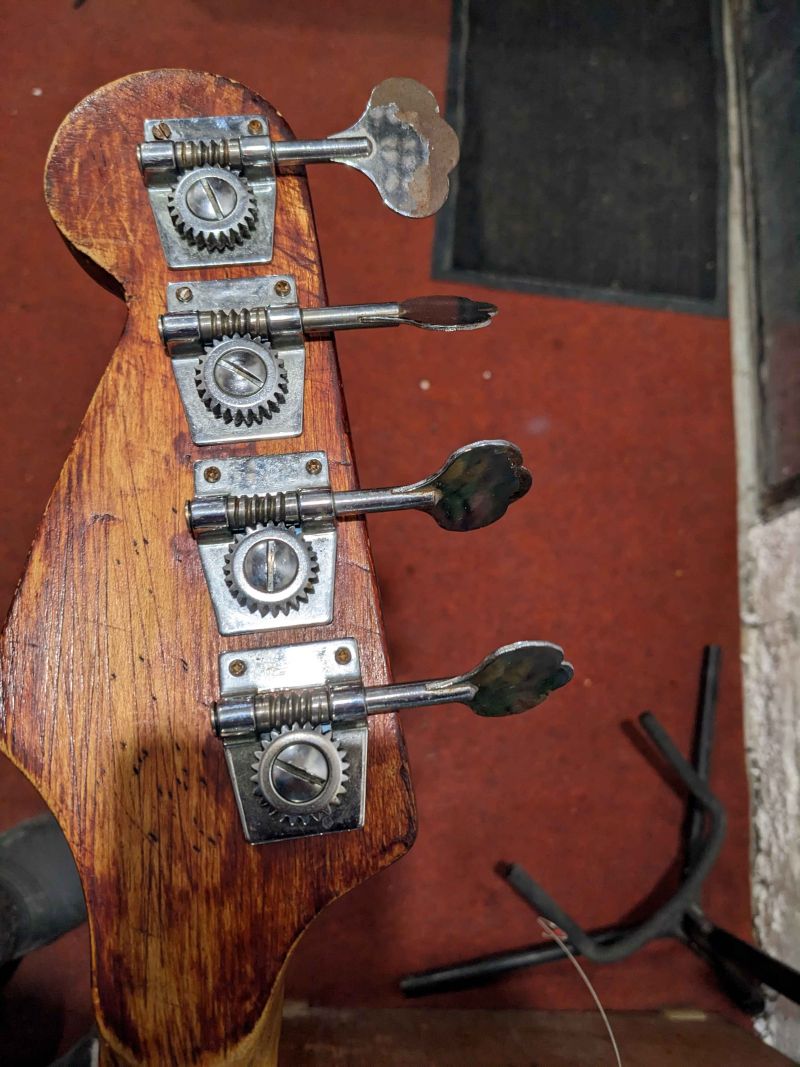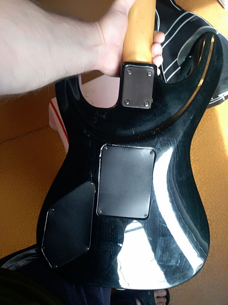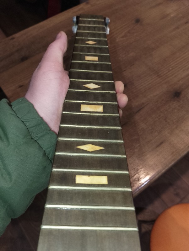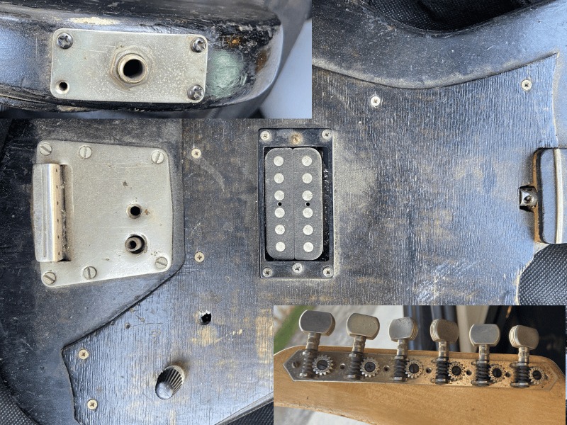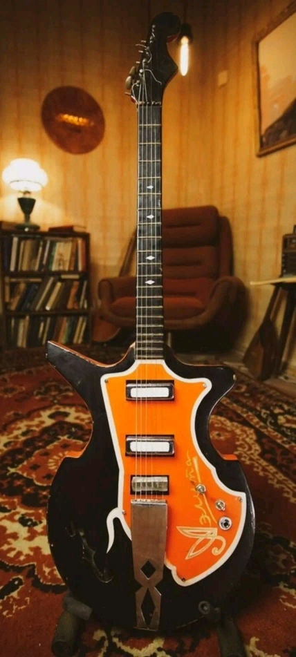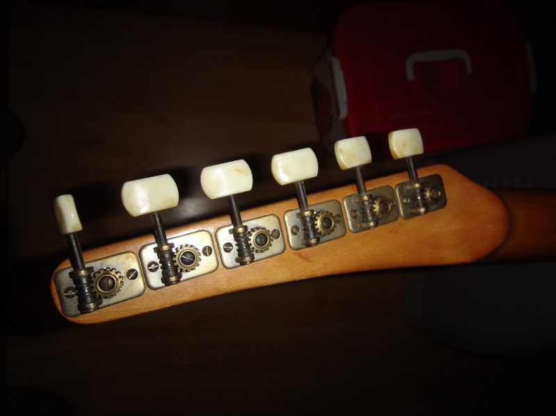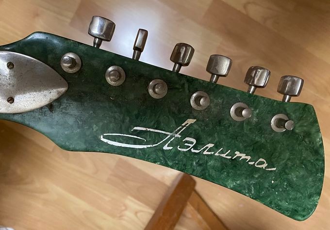 Интересная. Что уверенно можно опознать - алапаевские колки. Скорее всего стояли тут изначально, т.к у них одинаковые пластины, что у левых, что у правых, что не очень типично. Так что если бы здесь стояли когда-то другие, остались бы неприкрытые отверстия от шурупов. Тумблеры похожи на "МТ". Надпись в кармане кажется на каком-то ломаном английском. Тремоло не серийное и не стандартное. Датчики тоже свои, похожие вообще на басовые. Накладка кажется без радиуса?