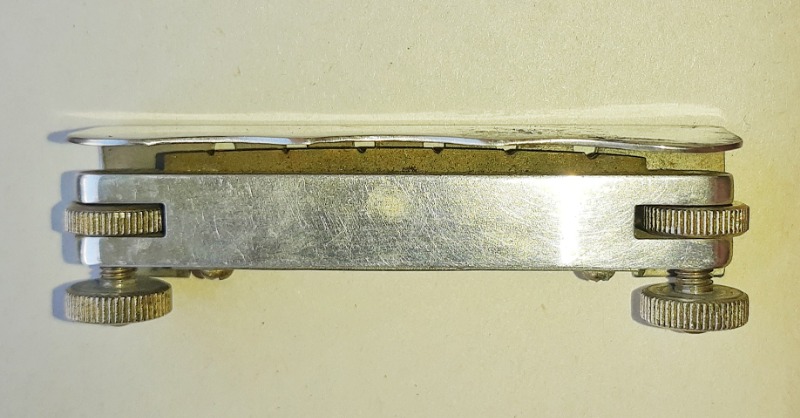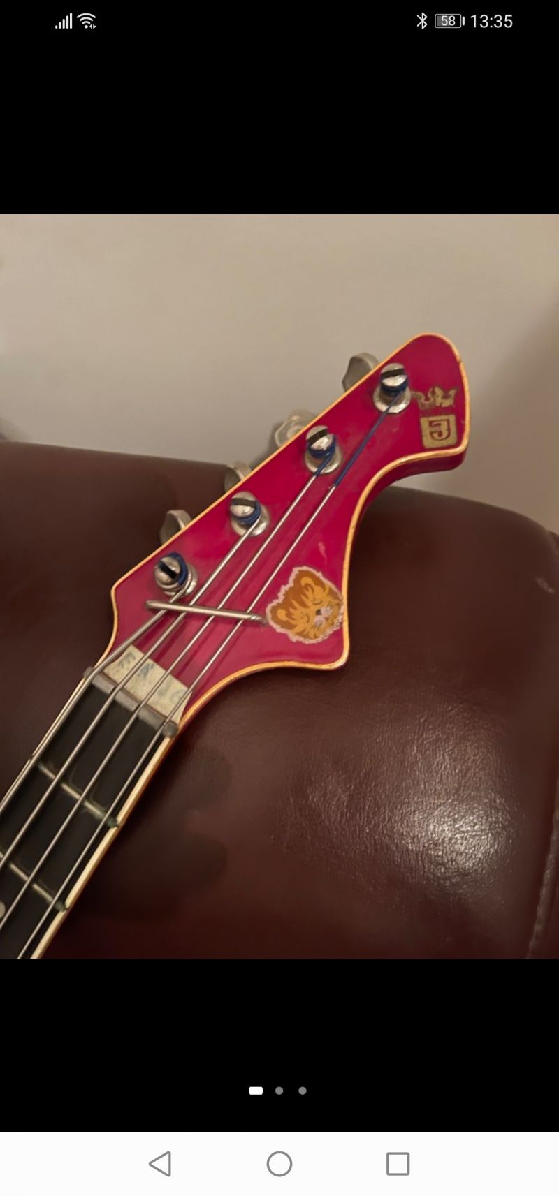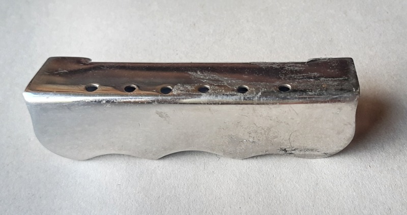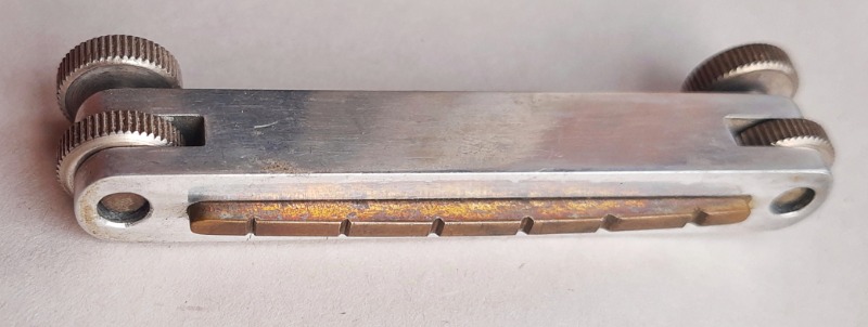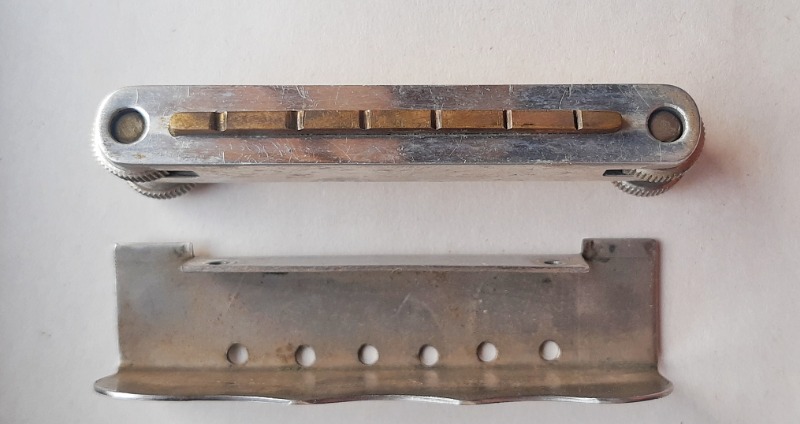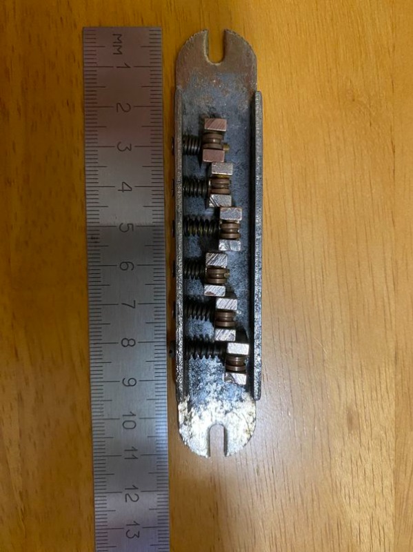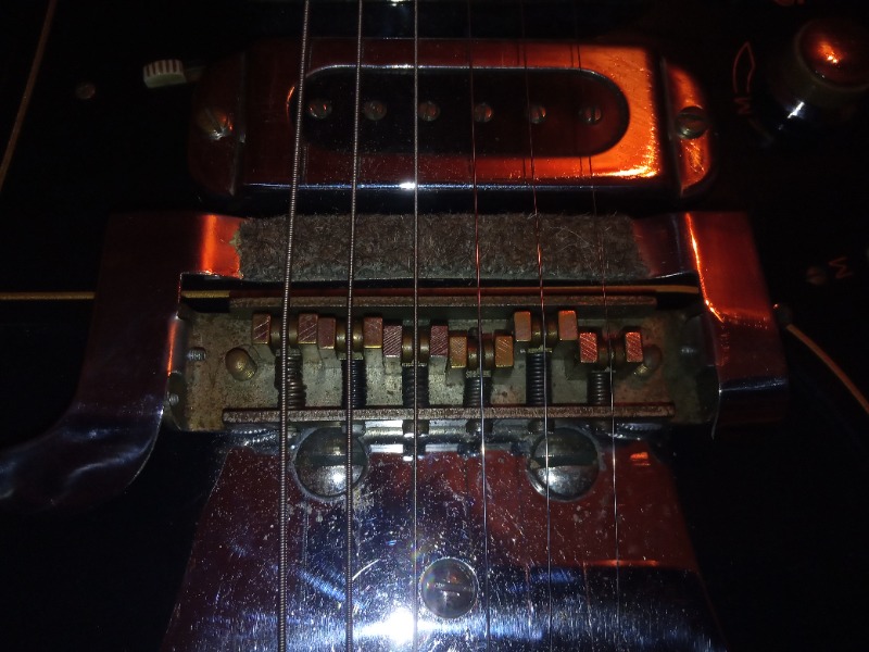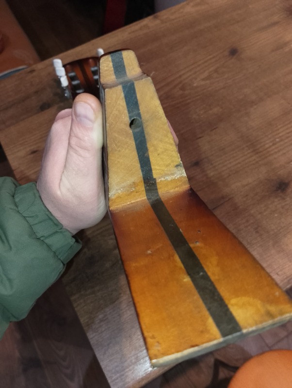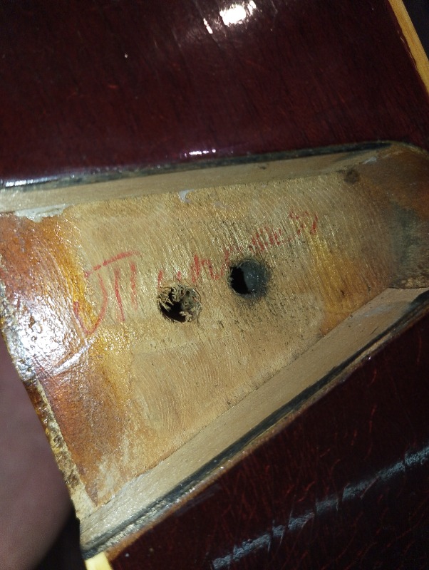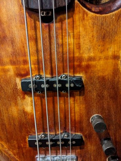 Интересная. Что уверенно можно опознать - алапаевские колки. Скорее всего стояли тут изначально, т.к у них одинаковые пластины, что у левых, что у правых, что не очень типично. Так что если бы здесь стояли когда-то другие, остались бы неприкрытые отверстия от шурупов. Тумблеры похожи на "МТ". Надпись в кармане кажется на каком-то ломаном английском. Тремоло не серийное и не стандартное. Датчики тоже свои, похожие вообще на басовые. Накладка кажется без радиуса?